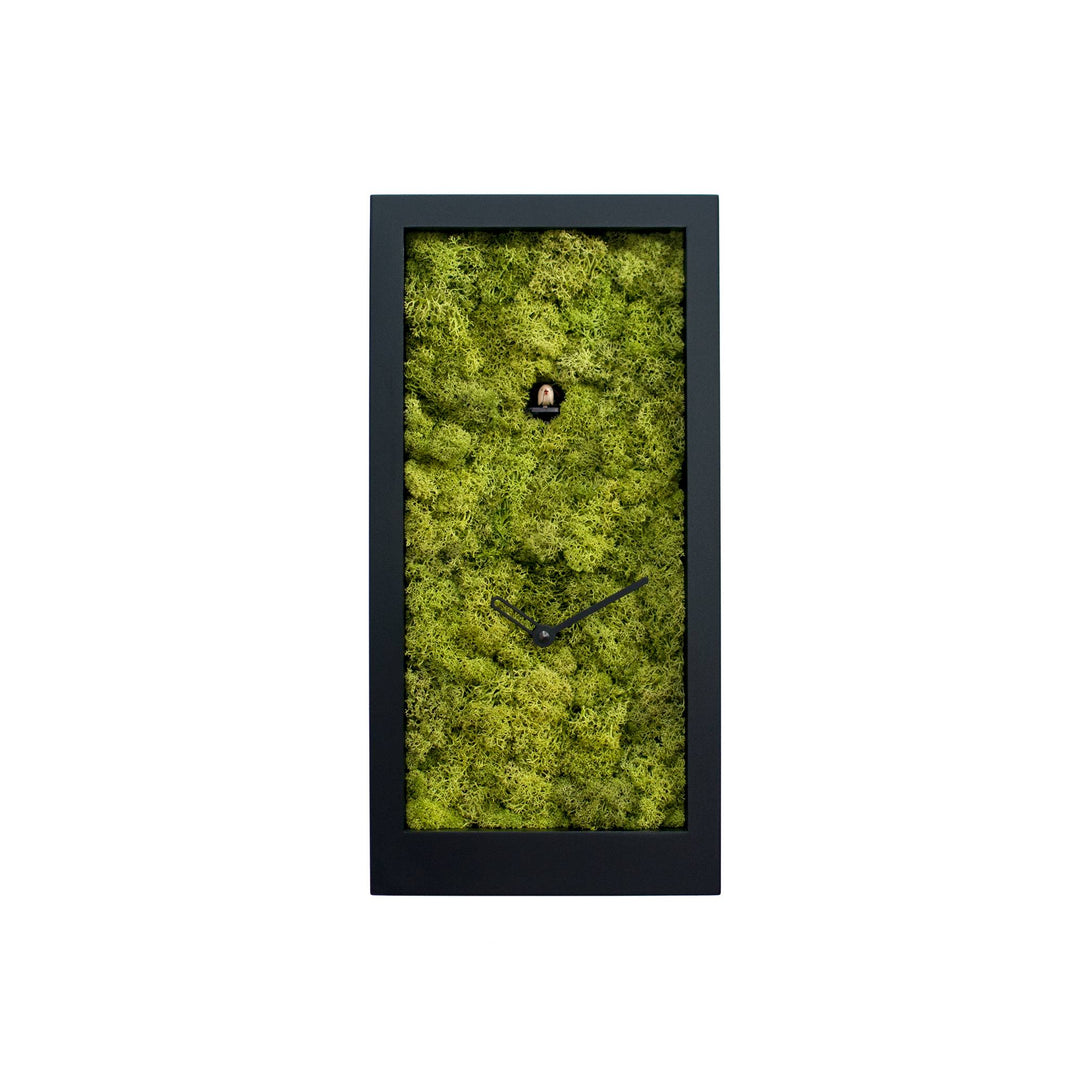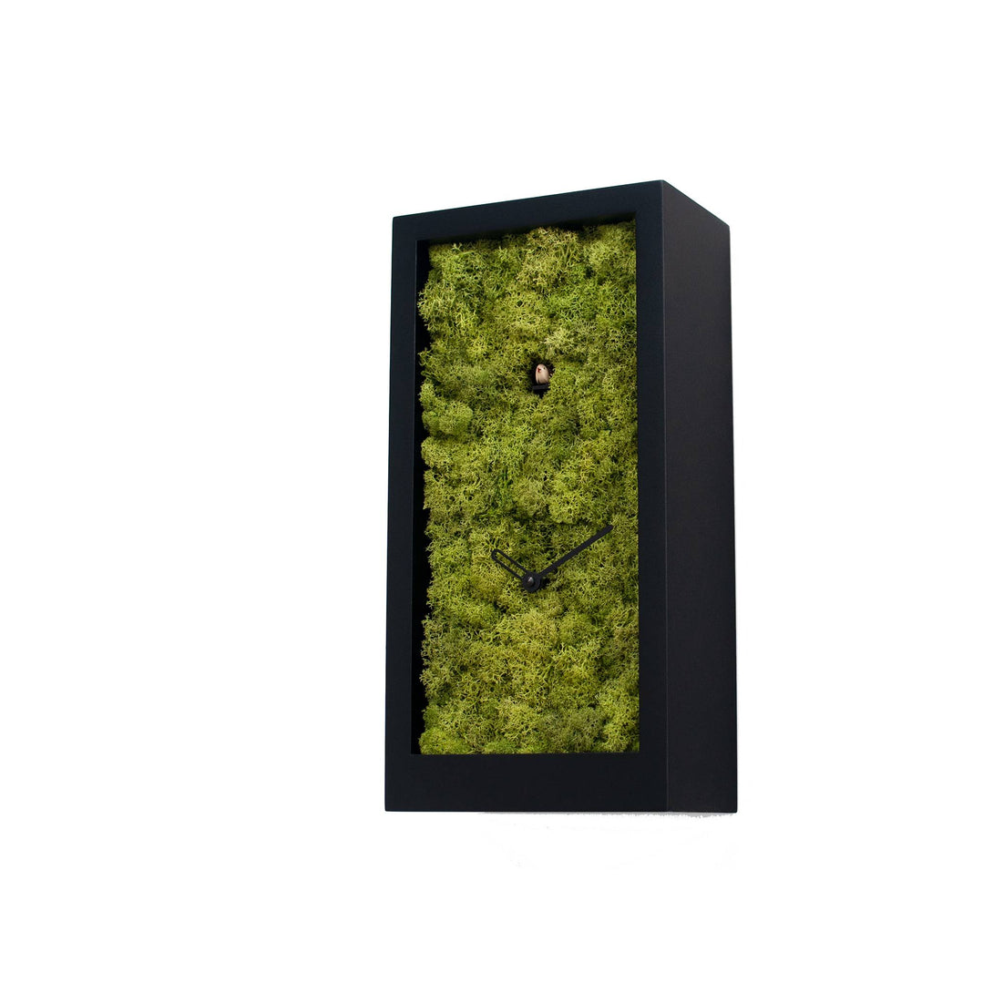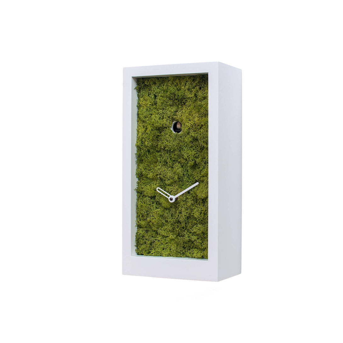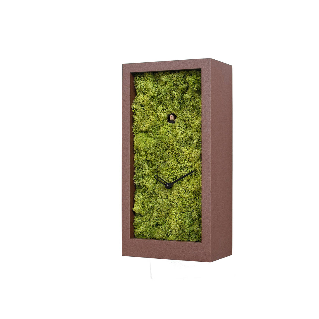 Amazon Cuckoo clock designed for Progetti by Ewald Winkelbauer, appears, as its name suggests, immersed in the Amazonian forest, from which it emerges every hour to sing and chime the time. Its cuboid, sharp-edged structure and essential design make it a modern piece that is well suited to any environment. It is available in three colors: white, black and metallic brown with a material effect.