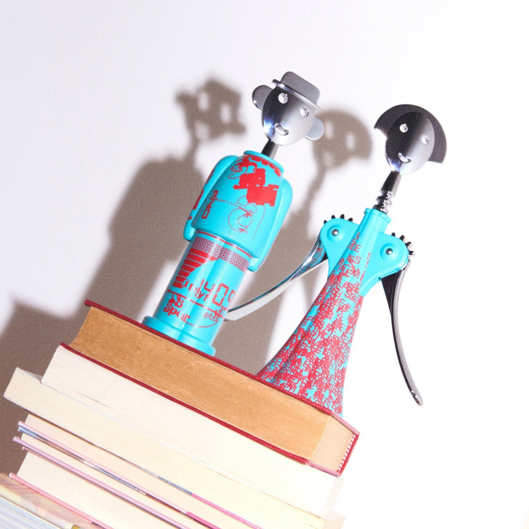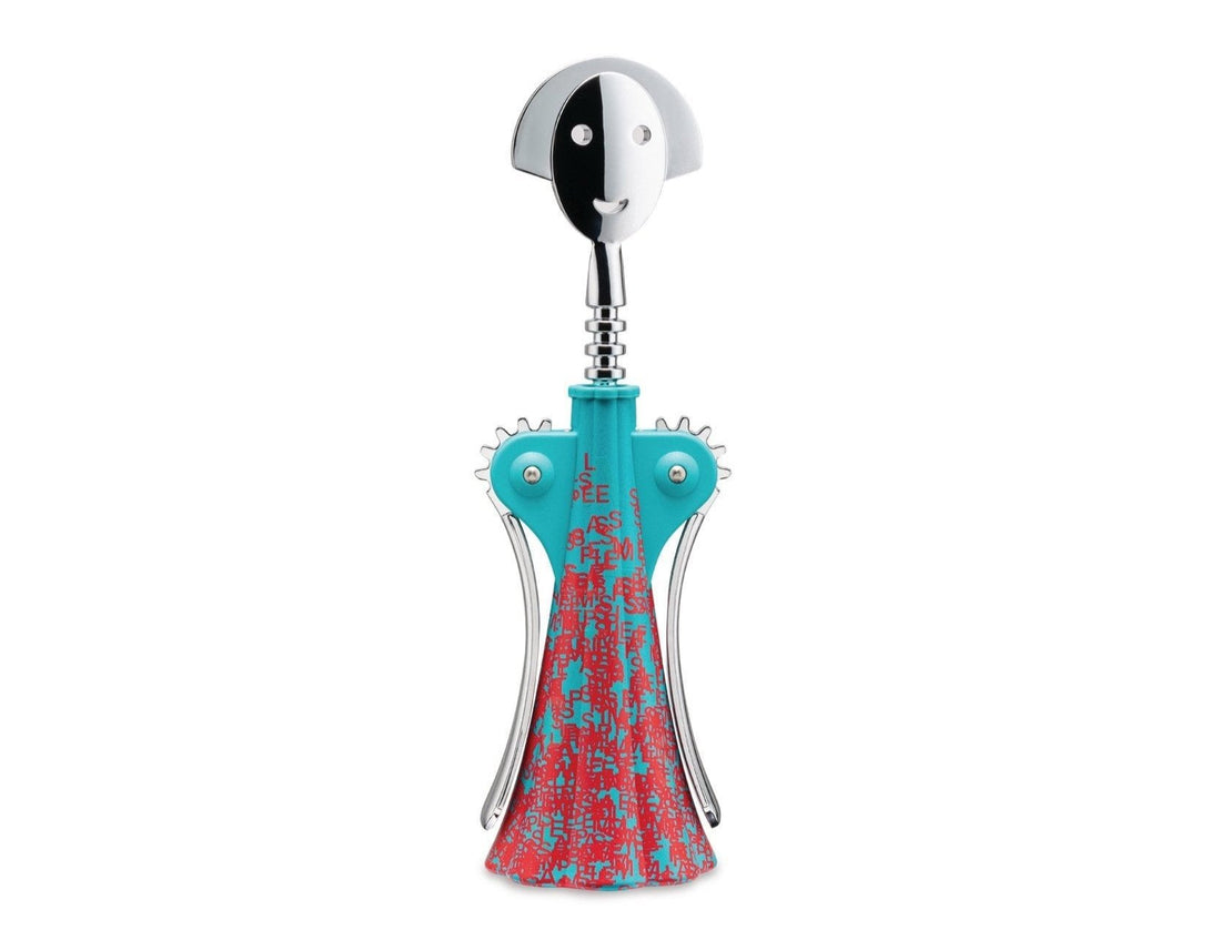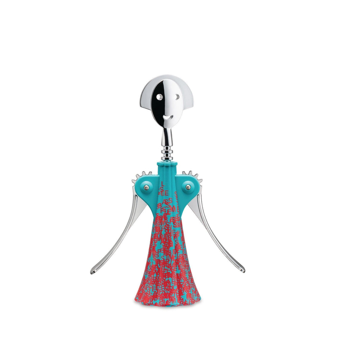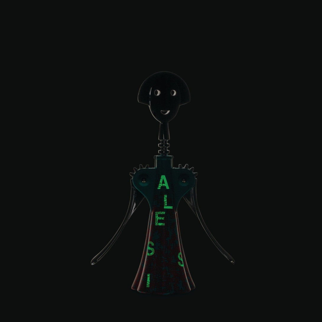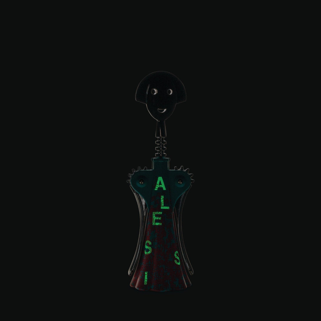 The creative trio from Studio Temp draws from the deep reservoir of street art to create a contemporary and cryptic interpretation of the iconic corkscrew by Alessandro Mendini. The graphic presented is the result of a personal imprint full of eclectic ideas, ranging from street signs to modern data protection techniques. The decoration contains phosphorescent elements that are only visible in the dark.