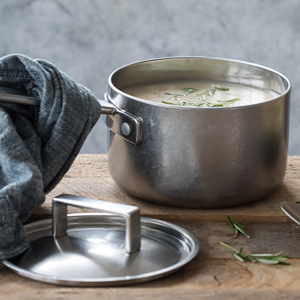 Minimalist design for this collection of high-performance pots and pans made even more special by the pewter finish that gives the whole collection a unique vintage look.