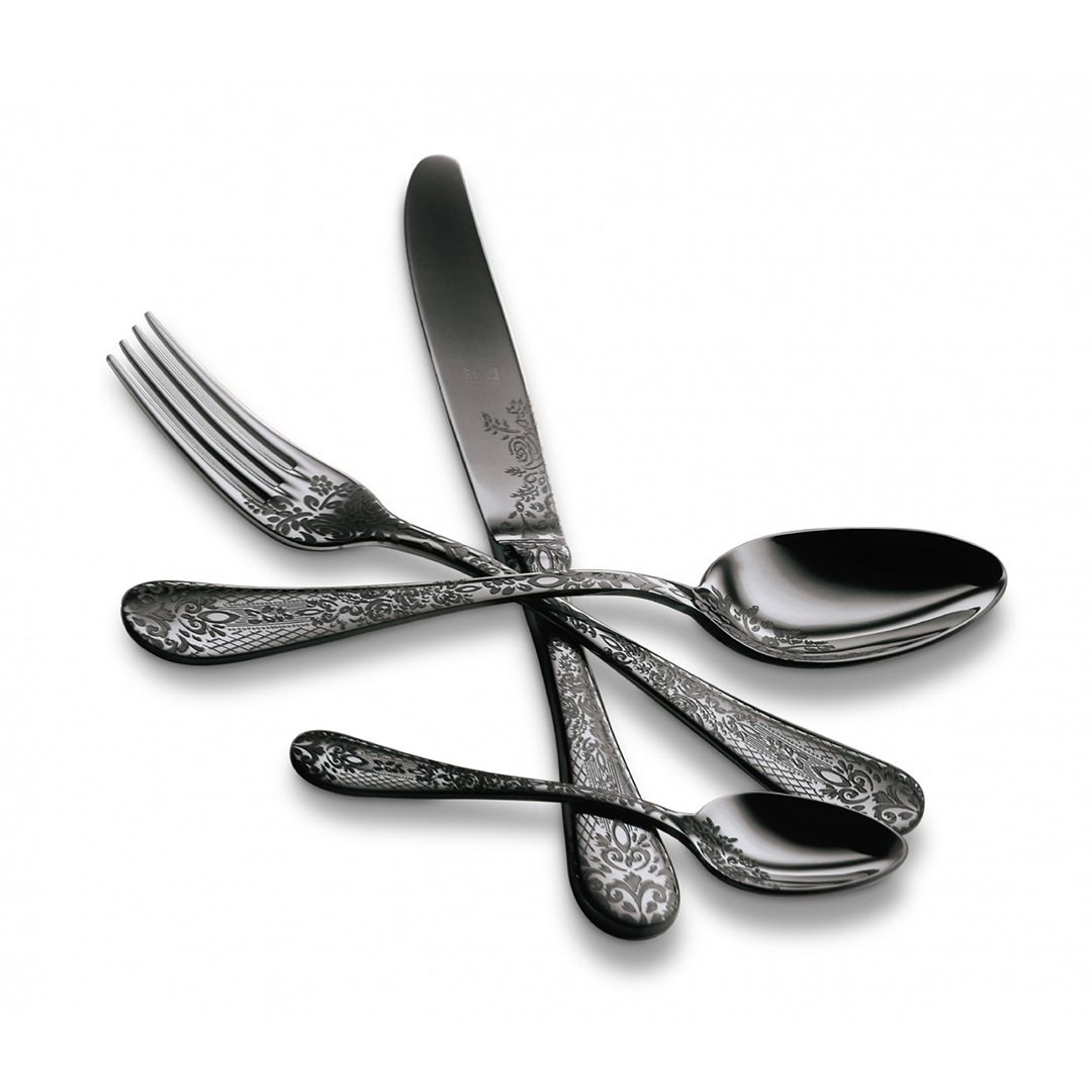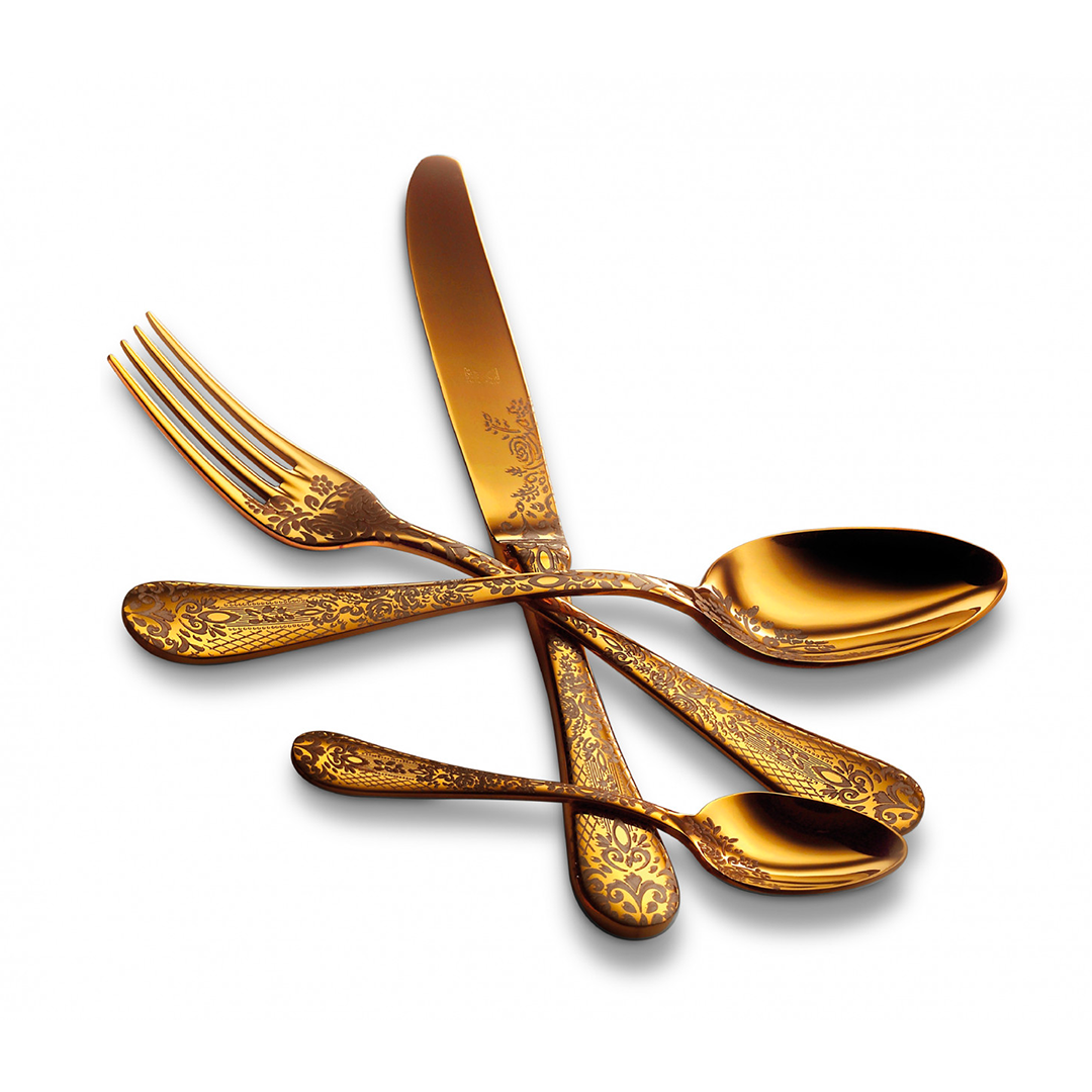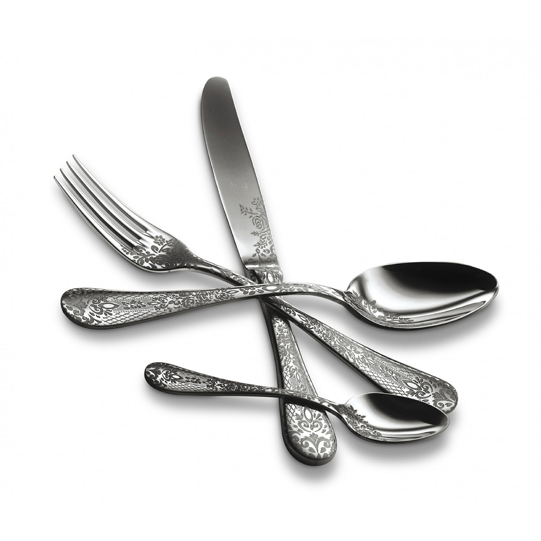 Made in 18/10 stainless steel and skillfully hand-painted with electronic laser engraver and the same skills used by ancient craftsmen. The set includes 4 table forks, 4 table spoons, 4 table knives and 4 coffee/tea spoons. Aavailable in polished stainless steel, gold, black and bronze.