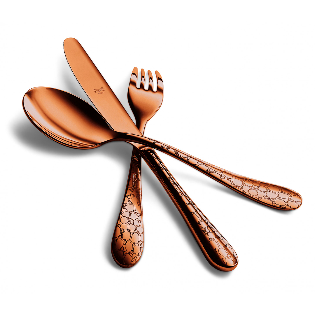 A unique set of cutlery, exclusively designed in Italy by Mepra designers. The pattern on each piece reminds of a crocodile skin and adds extra style and elegance to the set. Made in 18/10 stainless steel and skillfully hand-painted with electronic laser engraver and the same skills used by ancient craftsmen.