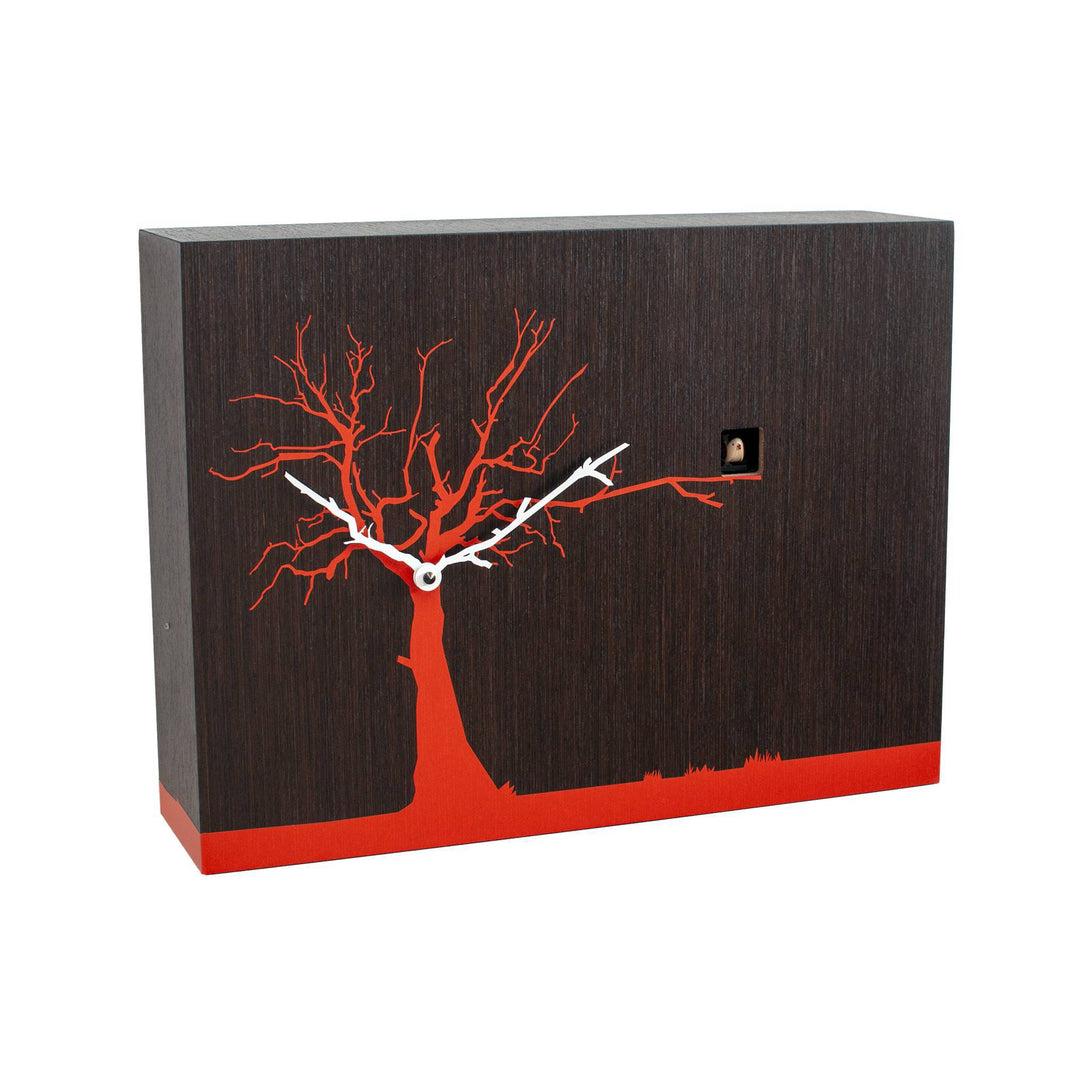 CùCùRùKù cuckoo wall clock by Progetti. Simple, elegant, linear but of great impact, a minimalist picture that stands out for its simple design. This is CùCùRùKù, a design item admired for its essential elegance, created by Riccardo Paolino e Matteo Fusi and among Progetti's best sellers. CùCùRùKù is a tribute to nature and in particular to the autumn and winter seasons when the trees shed their leaves. Wood becomes the dominant feature highlighting the prevailing warm colours of autumn that then become cold in winter with the snow. The cuckoo bird is situated on the longest branch sheltered from the bad weather. The hands of the clock, shaped like the branches, are available in orange, white or green. Battery quartz movement. The Cuckoo strike is switched off automatically during the night controlled by a light sensor.