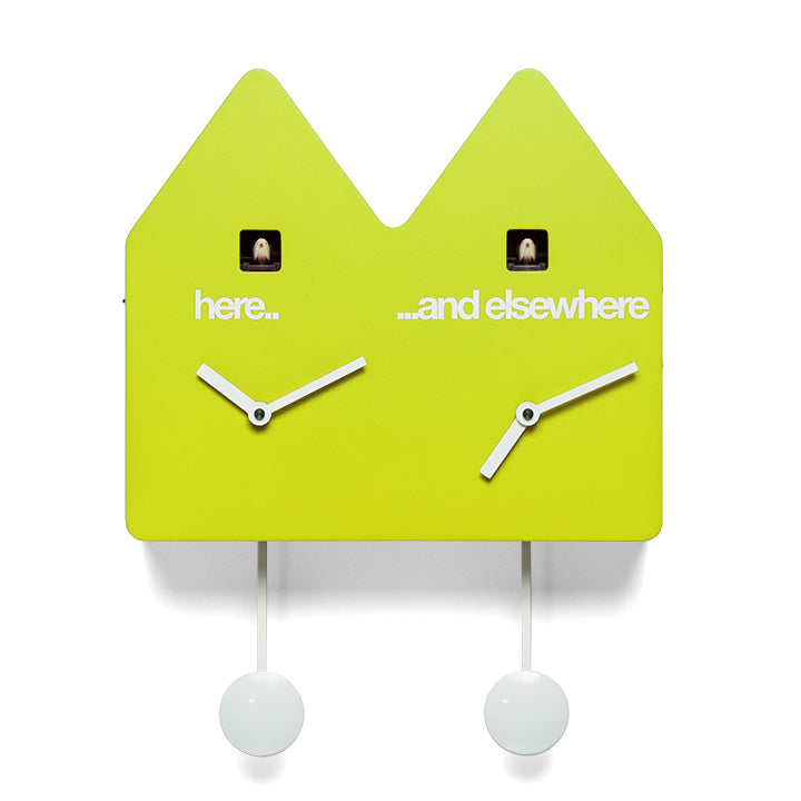 What time is it? And in Miami? Barcelona? Tokyo? Double Q cuckoo clock by Progetti satisfies the desire to always know the time of your favorite city in the world. It consists of two townhouses with bird and pendulum for two different times. Here ... and elsewhere.