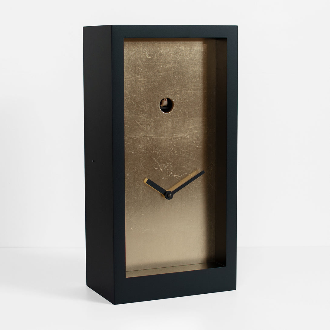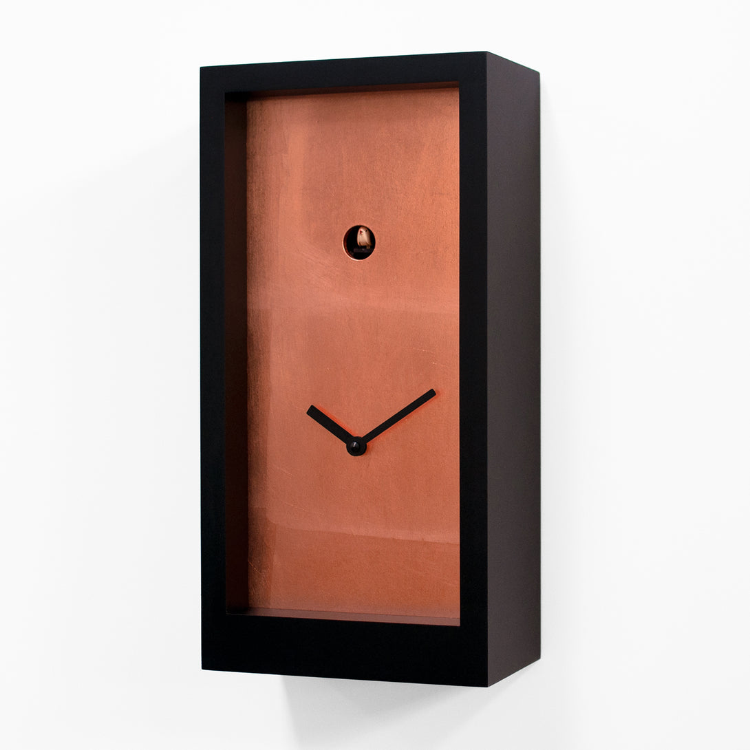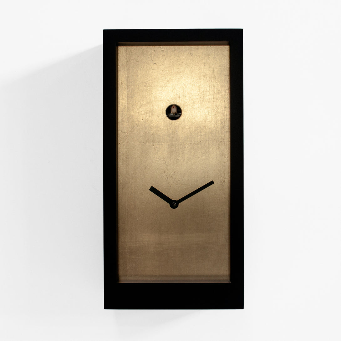 The face of the Fort Knox cuckoo clock by Progetti designed by Ewald Winkelbauer is skilfully crafted in gold, silver or copper leaf by expert hands. This very special, precious, elegant, age-old finish combines with the square-cornered, minimalist design parallelepiped frame to give a modern look that suits any environment. Can be used wall mounted or free standing. Made from wood coated with non-toxic paint.