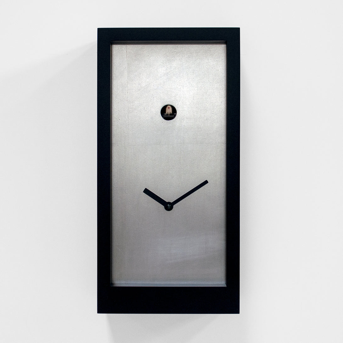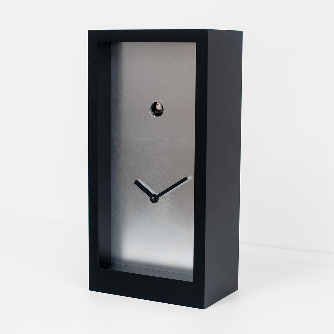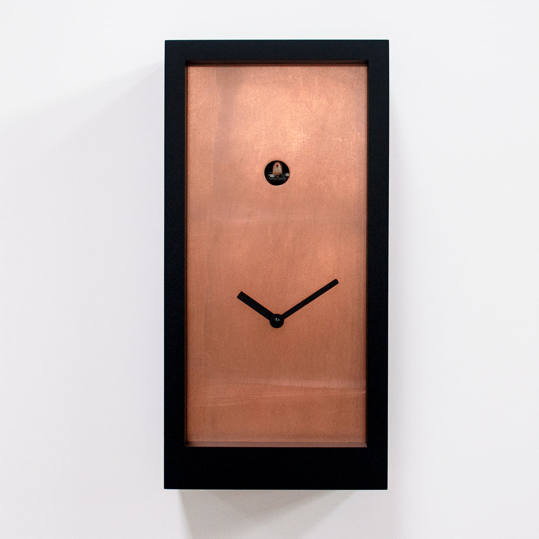 The face of the Fort Knox cuckoo clock by Progetti designed by Ewald Winkelbauer is skilfully crafted in gold, silver or copper leaf by expert hands. This very special, precious, elegant, age-old finish combines with the square-cornered, minimalist design parallelepiped frame to give a modern look that suits any environment. Can be used wall mounted or free standing. Made from wood coated with non-toxic paint.