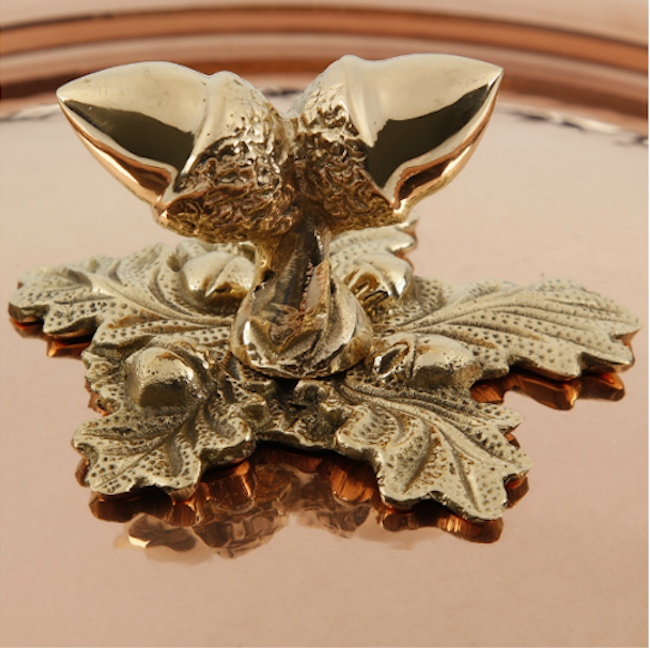 Recommended for cooking on the gas stove or in the oven, they are manufactured in solid copper of 1 to 1.5 mm thickness. Hammered and tin lined by hand on fire they have handles made of hand-cast brass, and so are the sculpted acorns decorating the lid’s handle, that add a crowning touch to the unique quality of the piece.