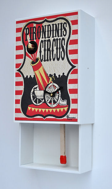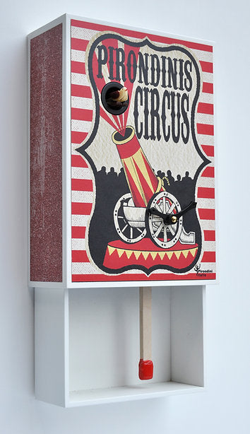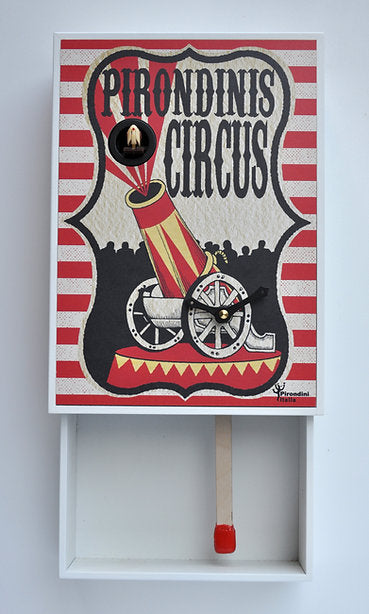 The cuckoo for those who love to collect matchboxes (and not only), as revisited by designer Marco Bedognetti in a special collection of cuckoo clocks for which the artist Nicole Da Porto, inspired by advertisements for circus shows, has created four graphic themes, "Pirondini's Circus".