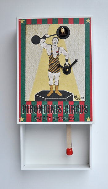 The cuckoo for those who love to collect matchboxes (and not only), as revisited by designer Marco Bedognetti in a special collection of cuckoo clocks for which the artist Nicole Da Porto, inspired by advertisements for circus shows, has created four graphic themes, "Pirondini's Circus".