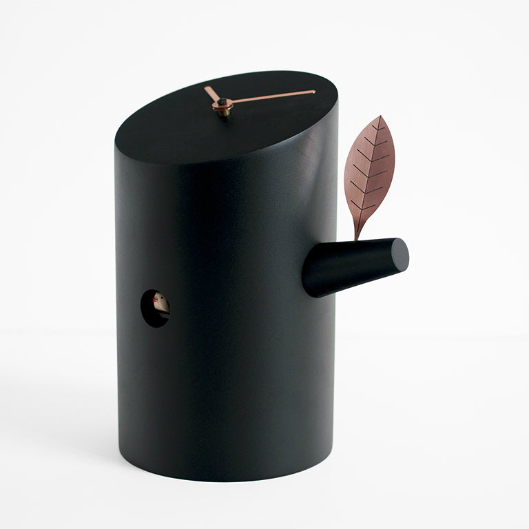 Nido table cuckoo clock by Progetti is an innovative cuckoo clock designed by Nazzareno Ruspolini. The designer was inspired by the very simplest of our flying friends' homes: a hole in a trunk. A cylinder cut as if by a woodsman, a small branch and a copper leaf create the elegant and refined image that the designer wanted to convey with this design object. Perfect for any bookshelf, shelving or surface in the modern or traditional home or office. The copper hands are installed on an angled surface to ensure the clock can be read from any position.