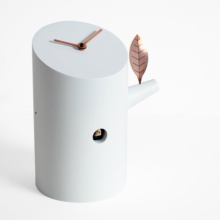 Produced with environmentally-friendly materials and non-toxic paints, the clock is available in either black or white, which both match the natural colour of copper perfectly. The battery-powered cuckoo has a sensor that ensures it does not sing at night as well as a button to regulate the volume of the sound or turn it off completely.