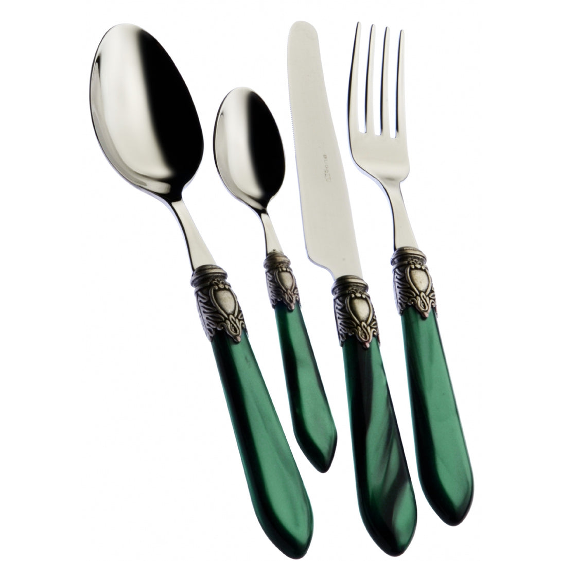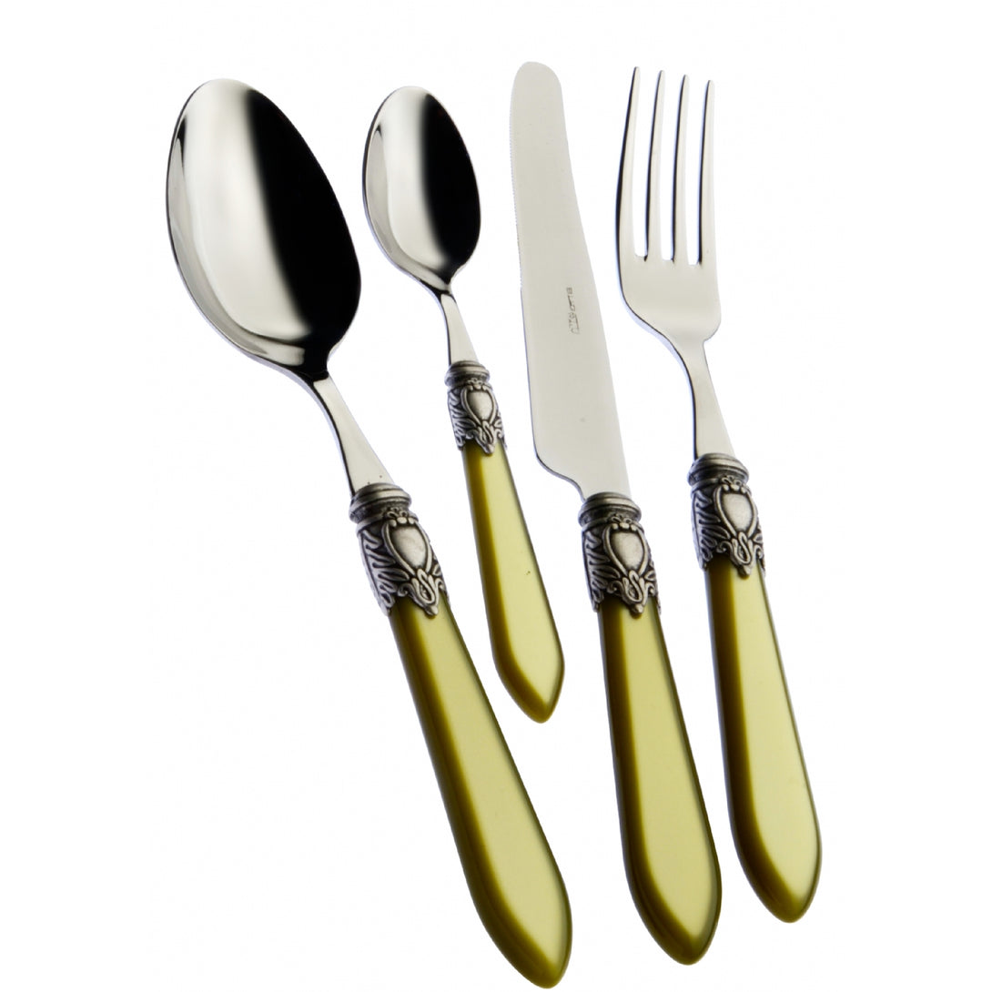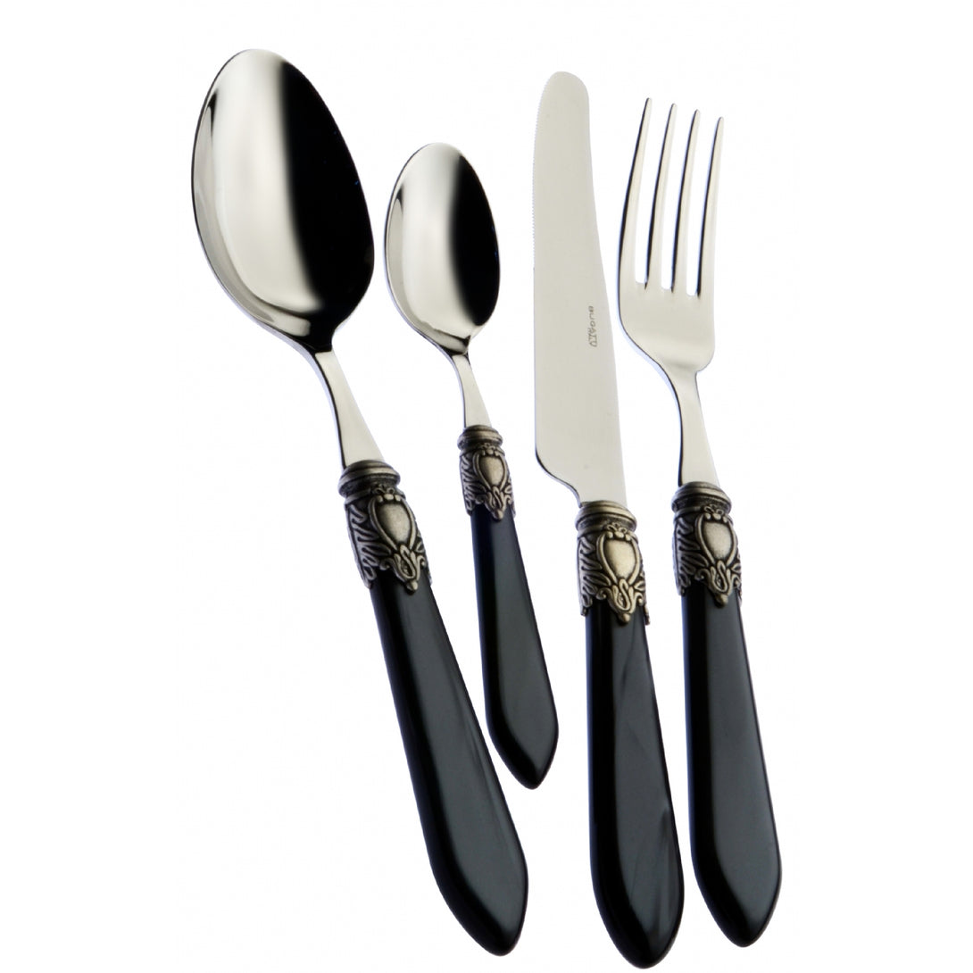 Hand wash or dishwasher safe up to 50/55°C. The set is composed of: 6 table spoons, 6 table forks, 6 table knives and 6 coffee spoons.