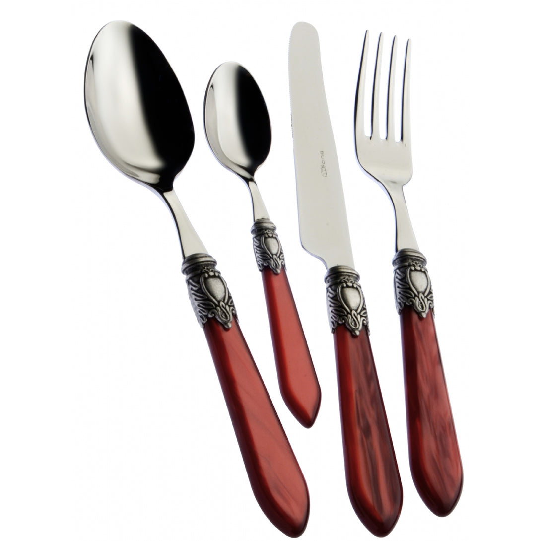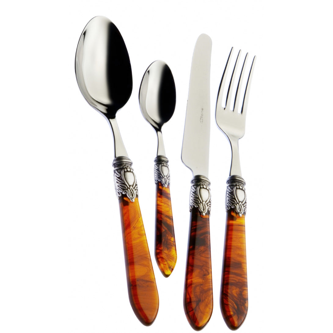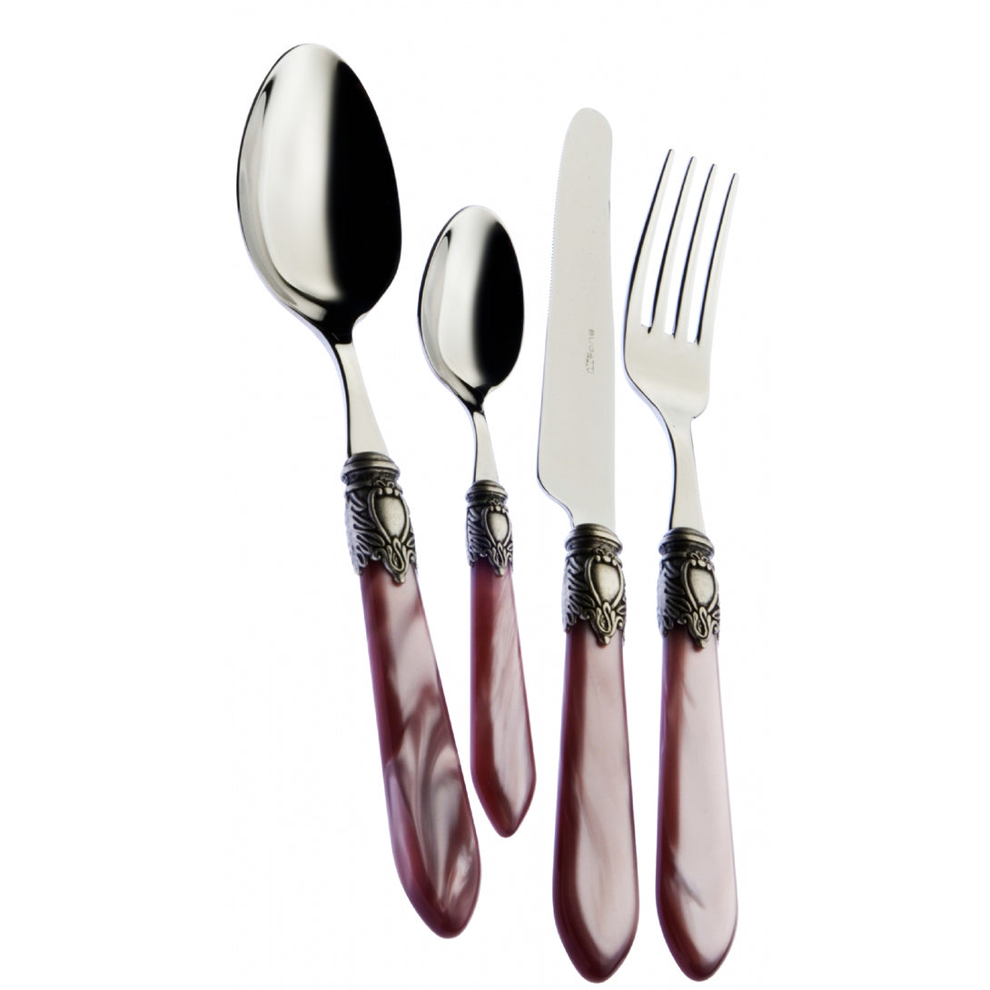 Hand wash or dishwasher safe up to 50/55°C. The set is composed of: 6 table spoons, 6 table forks, 6 table knives and 6 coffee spoons.