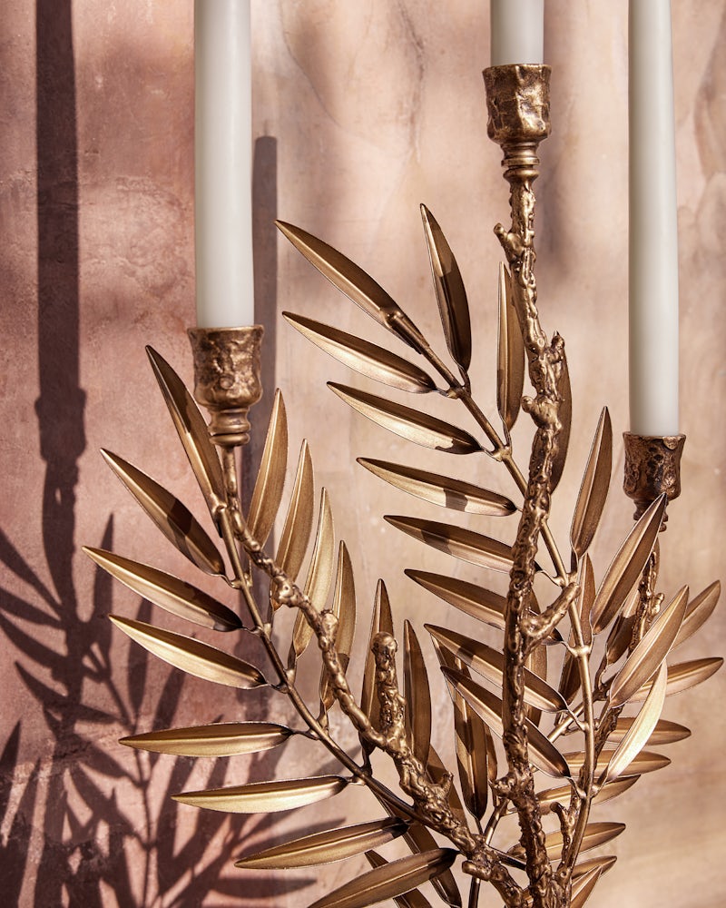 Add a chic and modern accent to just about every corner of your home with this exquisite Palm Candle Stick by Aquazzura. Crafted from polished brass in a chic it features a leaf design with a holder for three sticks. Use on its own or paired with other taper holders from the set.