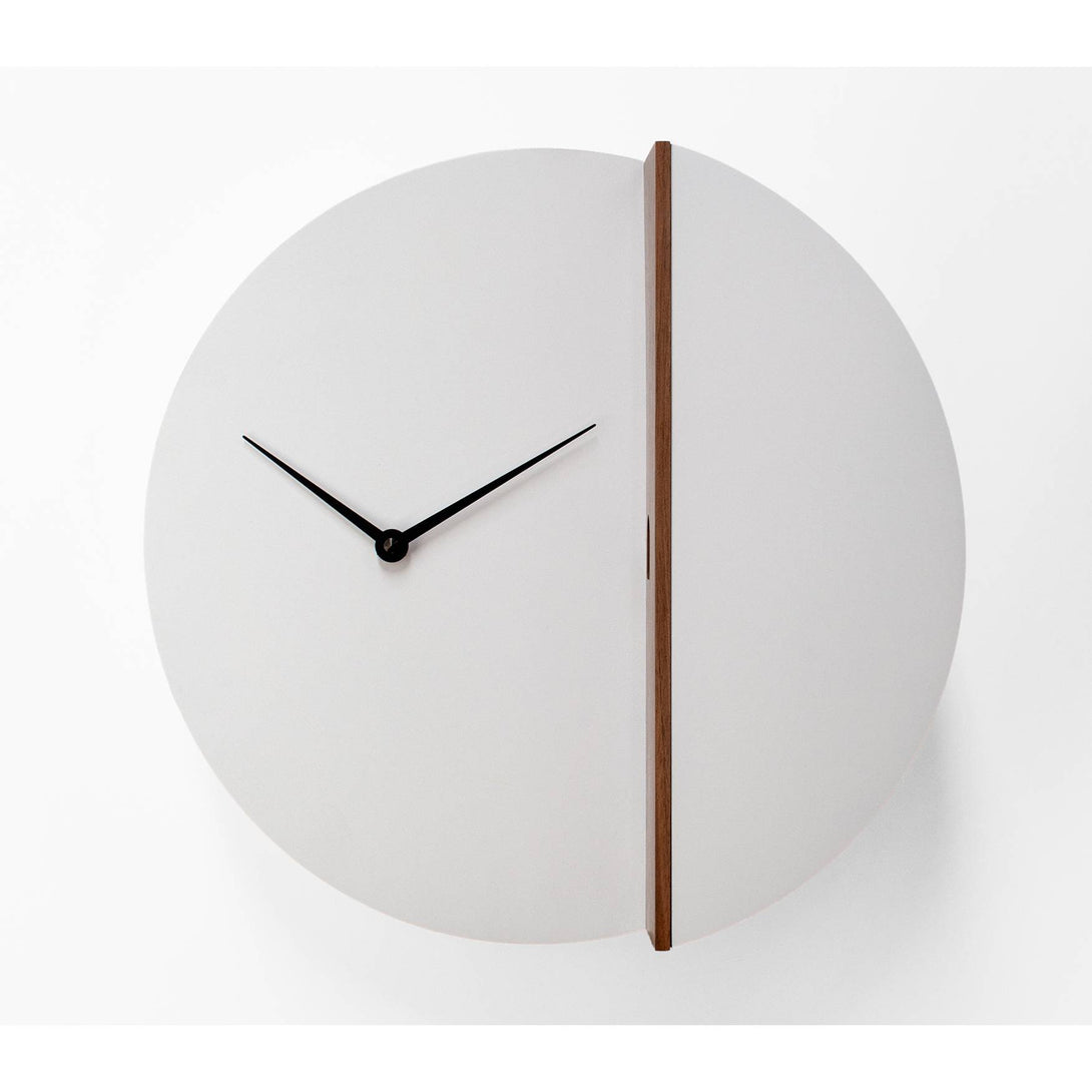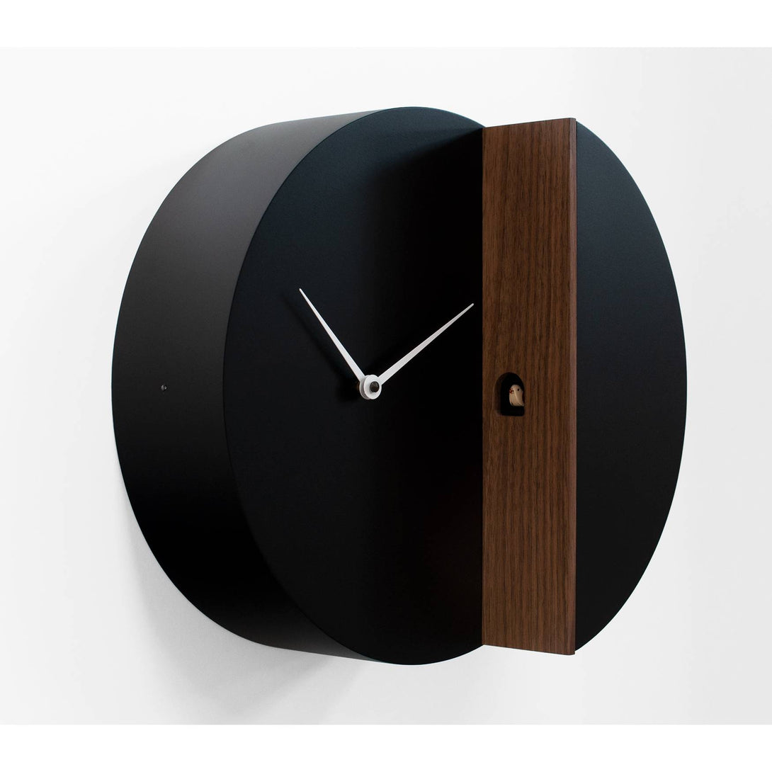 Peek-a-Koo Cuckoo clock designed by Krit Jiratkaruen for Progetti changes the perspective for this type of clock. We are used to seeing the bird come out of the centre of the clock, but, in this case, it comes out from the side toward the middle of the face. It is a clock with a captivating shape thanks to a combination of soft lines that, when paired with angular details, make it something completely new. It has been created with unique working methods and materials and comes in two colour variations. The insert in solid walnut adds a touch of elegance.