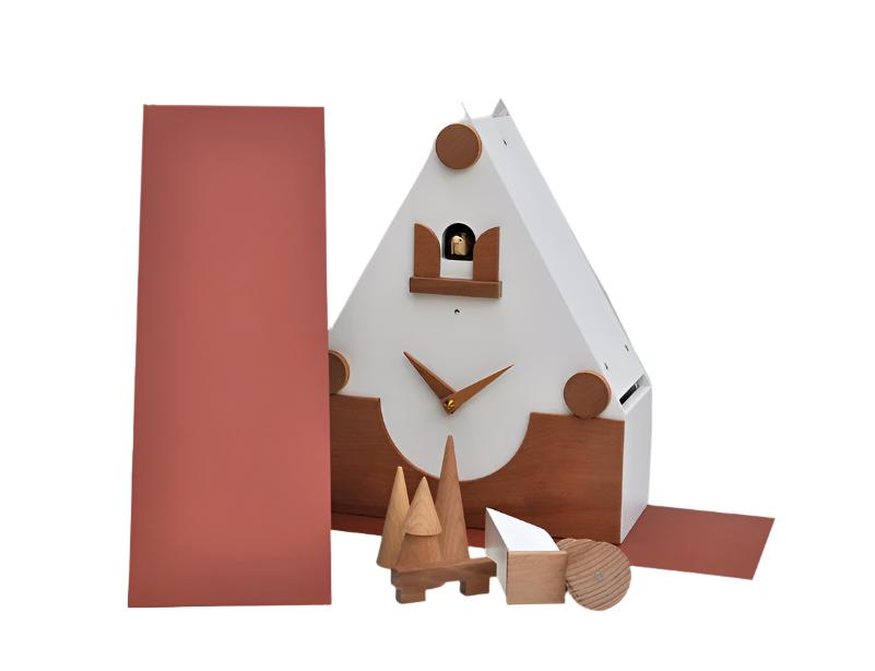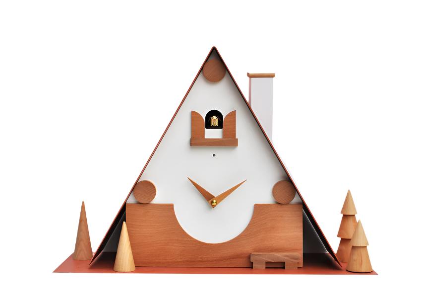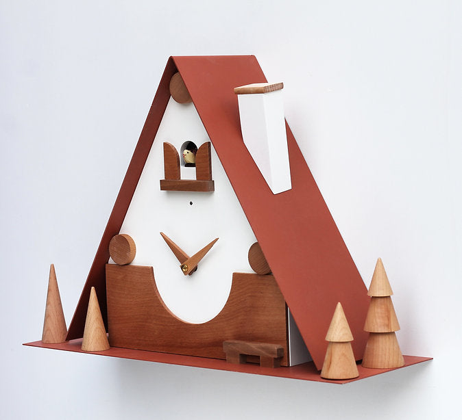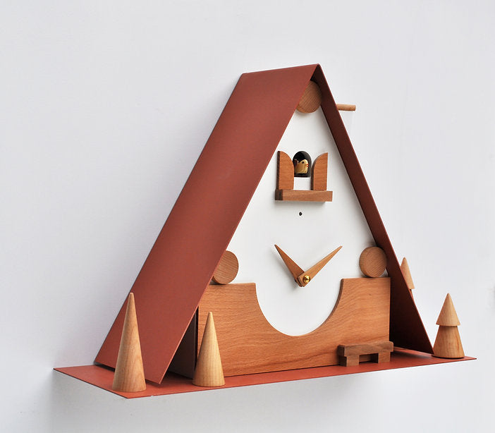 Pescegallo is the Italian answer to the original cuckoo clock designs. The cuckoo is characterized by a sheet metal roof and a base on which small solid wood trees can be arranged as desired. In this way it is possible to recreate a small bucolic landscape according to each one's taste and aesthetic sense. The clock recalls the huts of Italy's woods and the typical look of Italian mountain retreats. The cuckoo clock name is in fact a tribute to one of the villages in the valley where Pirondini is located.