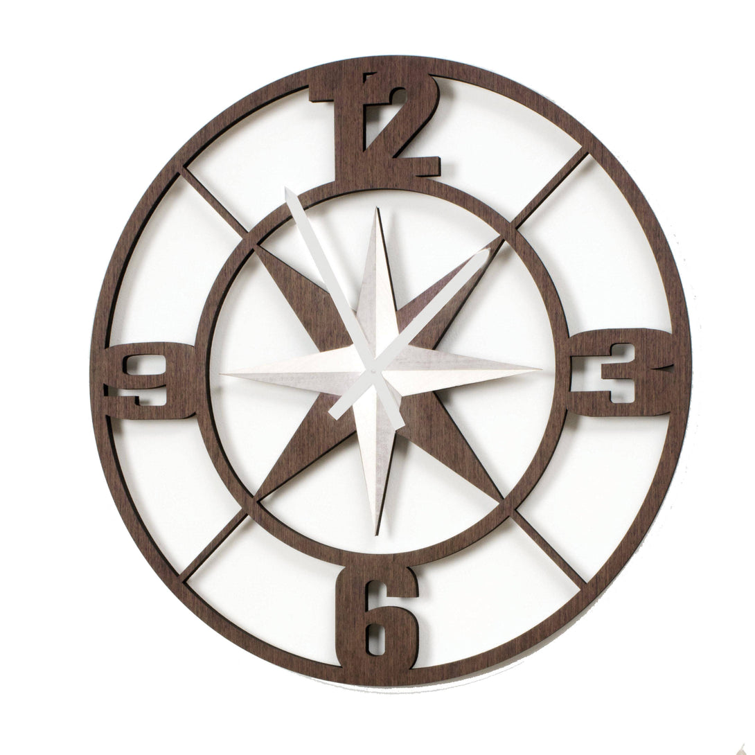 Rosa dei Venti wall clock by I Dettagli. The design of the clock was inspired by the windrose, which give a unique look to the clock. Perfect in livig rooms or hallways, the clock has been cut by laser, as all products by I Dettagli.