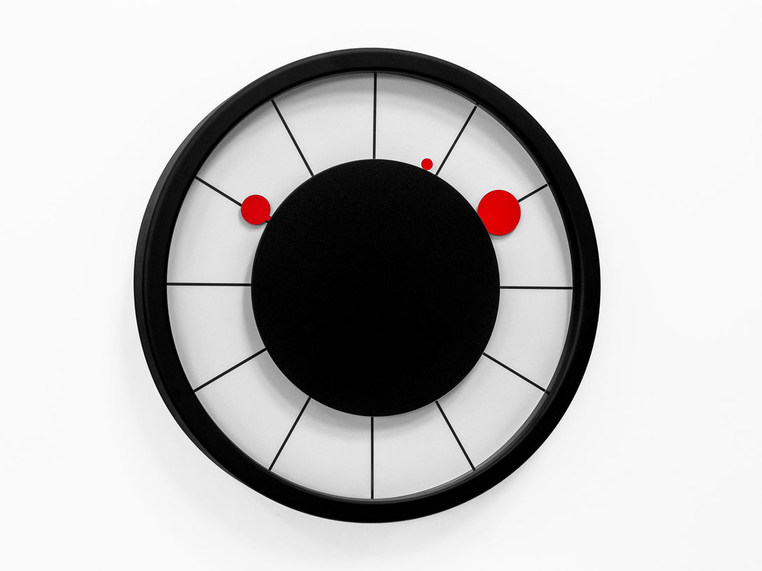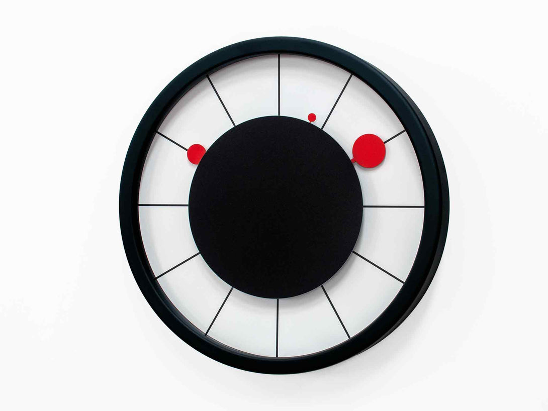 Roulette is an innovative wall clock designed by Bruna Rapisarda that recalls the well-known casino game. In fact, the hands, especially the second one, represent the ball spinning on the roulette wheel. The effect is emphasized by the disc printed on the glass which hides the stem of the hands, making only the round tip appear. Made of metal, plastic and glass, it is painted with non-toxic paints. German made battery operated quartz movement.