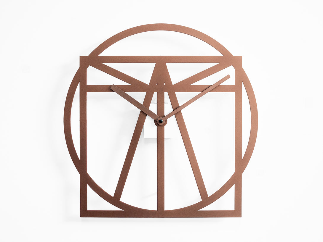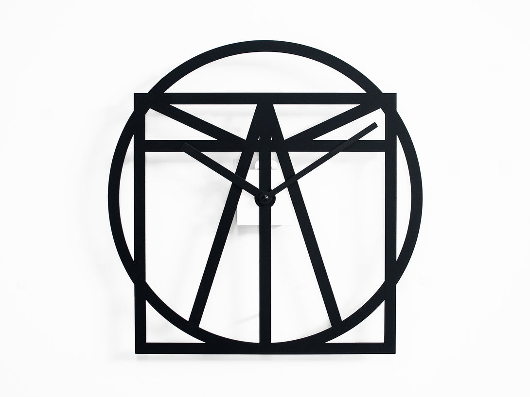 Vitruvius, designed by Eloisa Libera, is inspired by Leonardo da Vinci´s drawing of the Vitruvian Man, a study of the proportions of the human body based on his elaborations on Vitruvius´s work, a well-known Roman writer and architect who lived in the first century before Christ. The design is characterized by simple lines that intersect each other. The movement of the hands, which are the same color as the quadrant, appear to bring to life the man placed at the center of the quadrant and the circle that surrounds it. Made of metal painted with non-toxic paints. Quartz movement high-quality German-made battery powered.