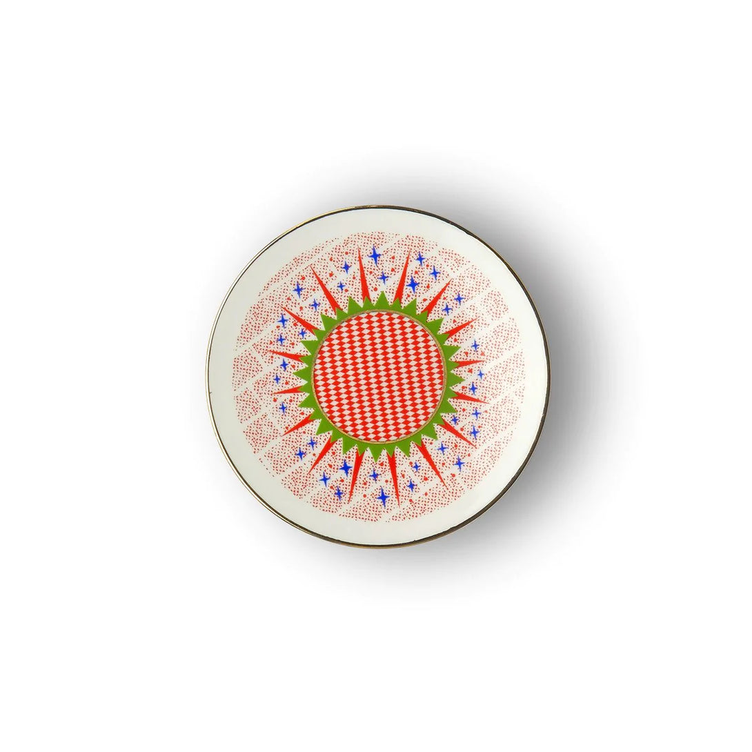 A wonderful aesthetic and nostalgic journey. Bel Paese is the new and unusual story created by French designer Sam Baron. These porcelain plates are decorated with beautiful vintage illustrations inspired by old "citrus papers". These small squares of silk paper decorated with a central motif were used to pack oranges in the last century. As part of the popular cultural heritage of the 20th century, citrus papers have become a rare commodity found only on the stalls of luxury grocers and collectors! The deliciously retro imagery is totally updated with flashy colours, modern patterns and offbeat details. Simple and showy, the patterns respond to a popular, naive inspiration, made up of poetry and ingenuous symbolism, traits that are reminiscent of children's drawings. Honest, warm tones, blue and red are the natural preference. A retro pop imagery, tinged with humour, poetry and mystery...