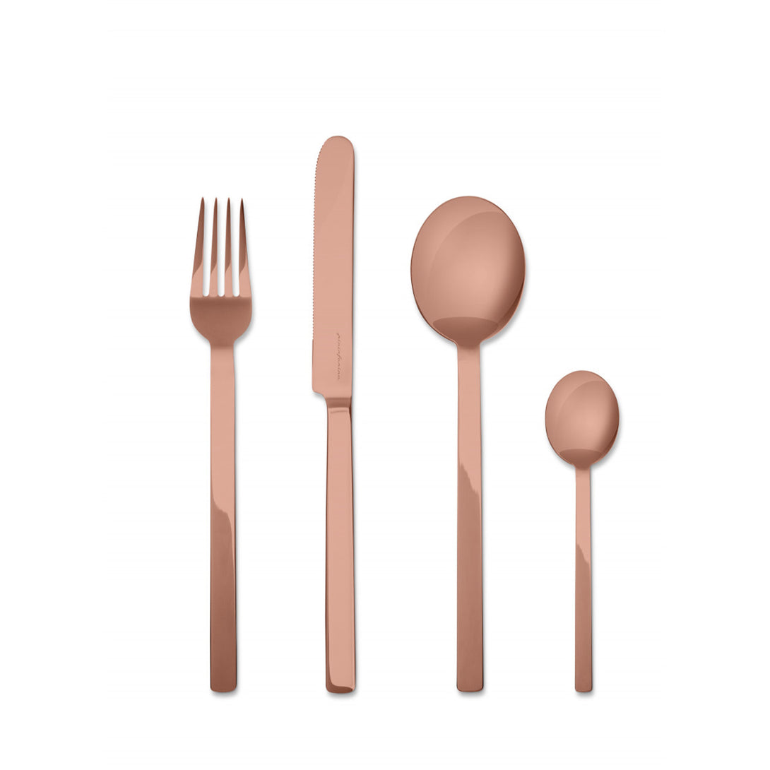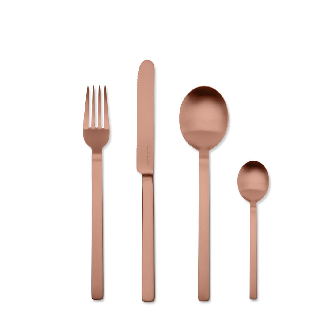 Winner of the Red Dot Design Award. Available in polished or matt bronze. The set includes 6 table knives, 6 table forks, 6 table spoons and 6 coffee and tea spoons.