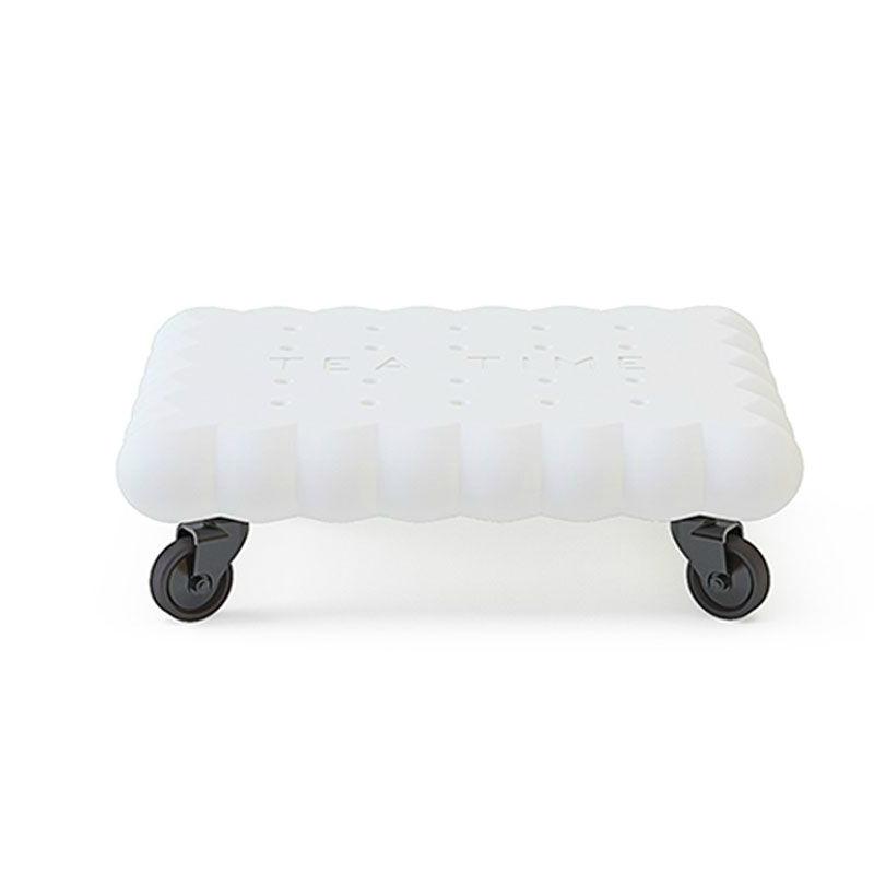 Tea Time by Slide designed by the eclectic architect and designer Gianni Arnaudo, is the original and fun coffee-table inspired by the stylized shape of a biscuit. The inspiration for Tea Time low table comes from the intuition to follow a project linked to food, “transforming” a classic tea biscuit into a furnishing design object. The legs are substituted by four industrial type wheels that pivot at 360° that allow easy movements.