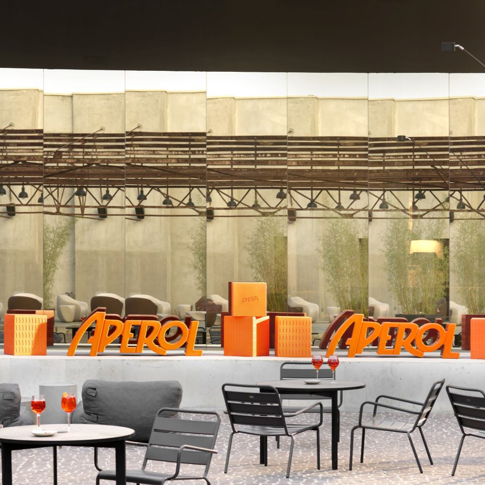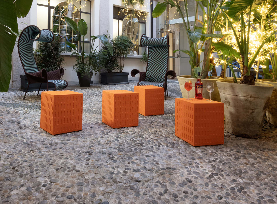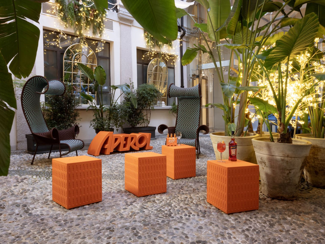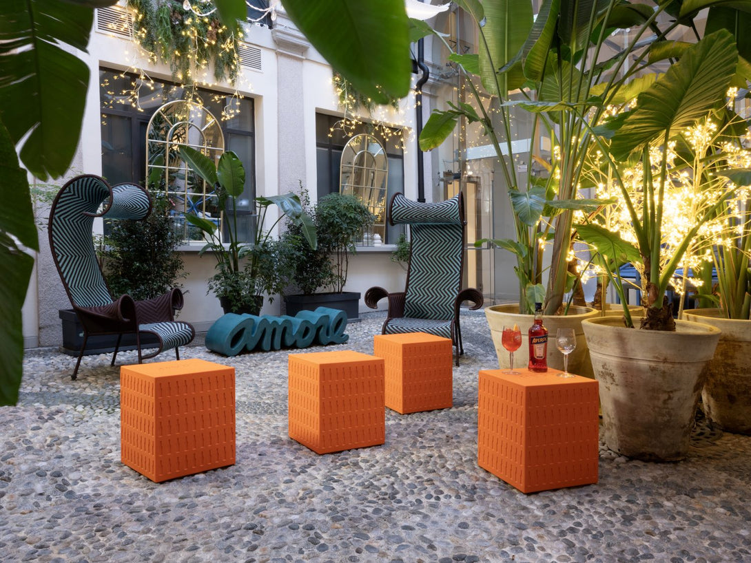 From the collaboration between Slide and Aperol comes this original cube, a versatile piece of furniture that brings with it the lively and iconic spirit of Aperol.