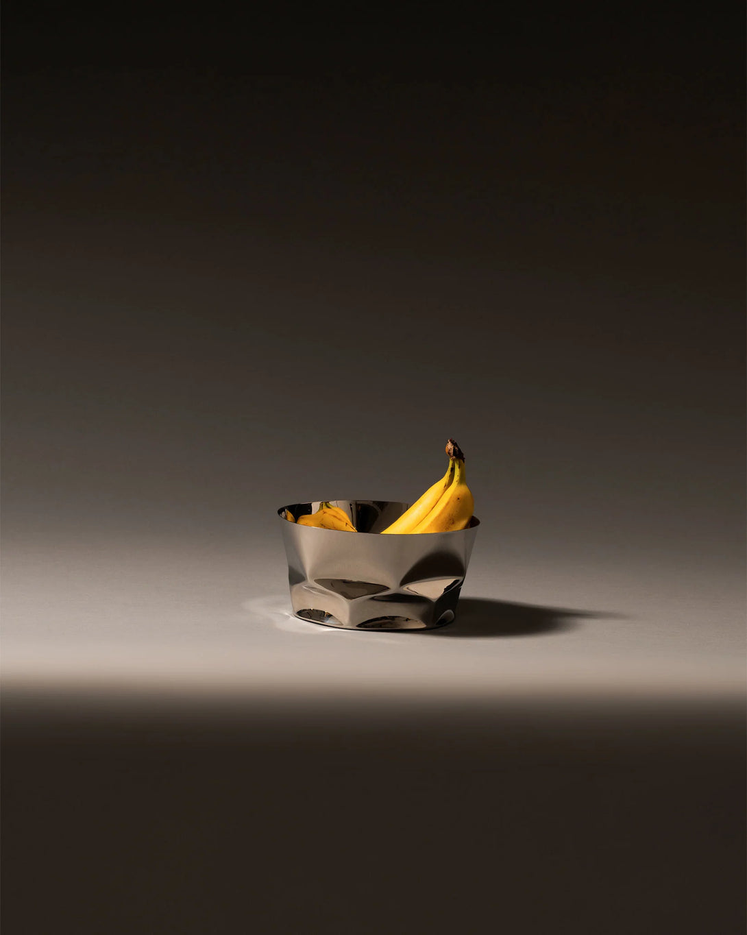 With his Compressioni project, Paolo Ulian has conceived a new way of forming sheet metal, a method that reveals uncanny expressivity. Composed of a basket, a centrepiece and an "unprecedented object", his triad of objects is a powerful encapsulation of the experiments he entertained with a master turner at his side. The three containers are first made on a lathe, then compressed to obtain the final shape. Trial after trial, it became clear that the deformations caused by crushing the semifinished articles were relatively controllable variables. The folds created on the bottom of the objects were almost magically arranged in geometric patterns – squares, pentagons, hexagons and octagons – giving fascinating regularity to the elements' unique differences.