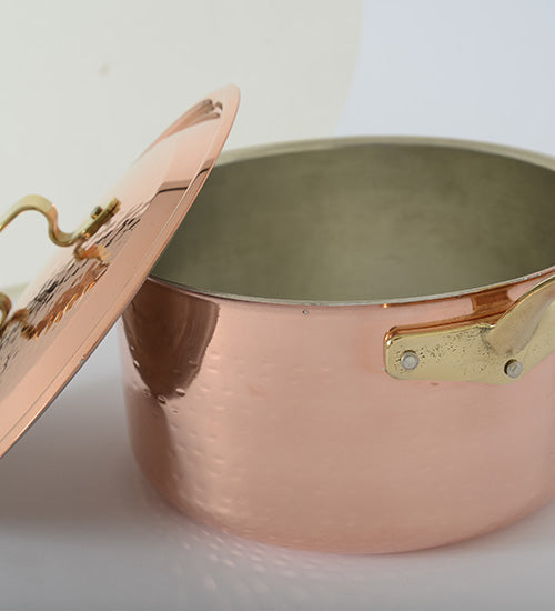 Each Tanucci piece is handmade and finished by master coppersmiths through the unique method of hand hammering that adds an incredible value and harmony to the pots and pans. The brass handles are elegant and easy to hold, while the interior is tin-lined, preventing copper from reacting with some type of foods and guaranteeing the best cooking performance. This process is performed by combining manual techniques with specialized equipment dedicated to the production of a professional line -- any visible stain is the result of this process and does not constitute a defect in production.