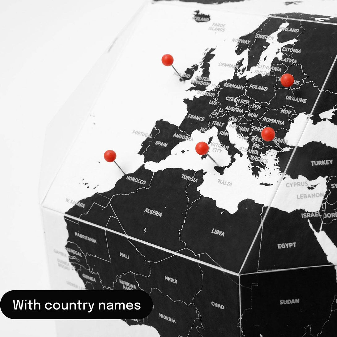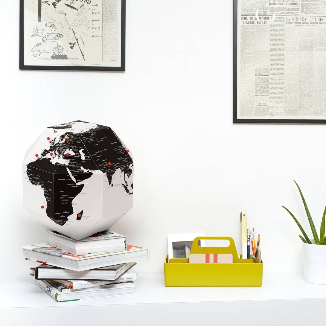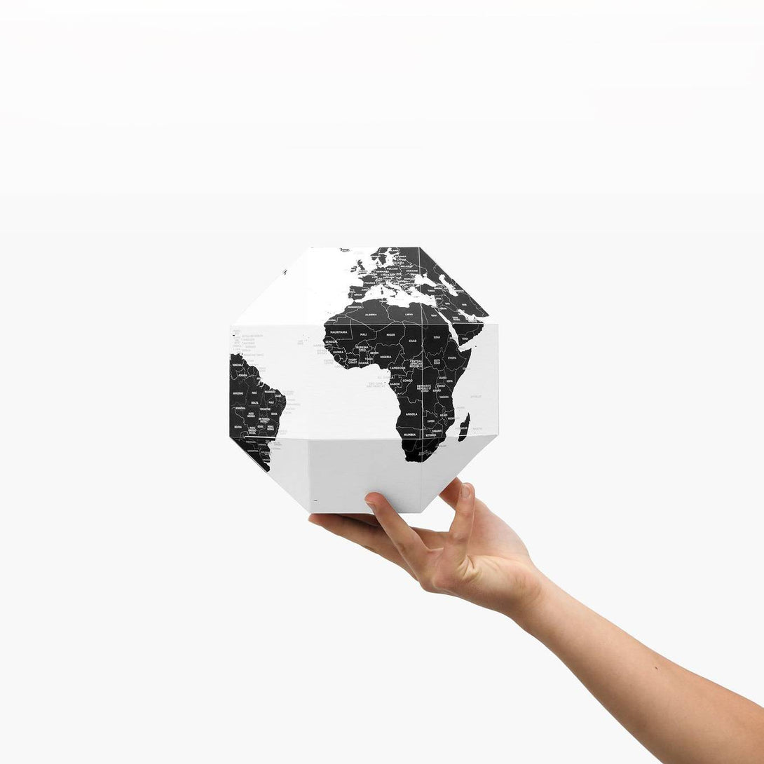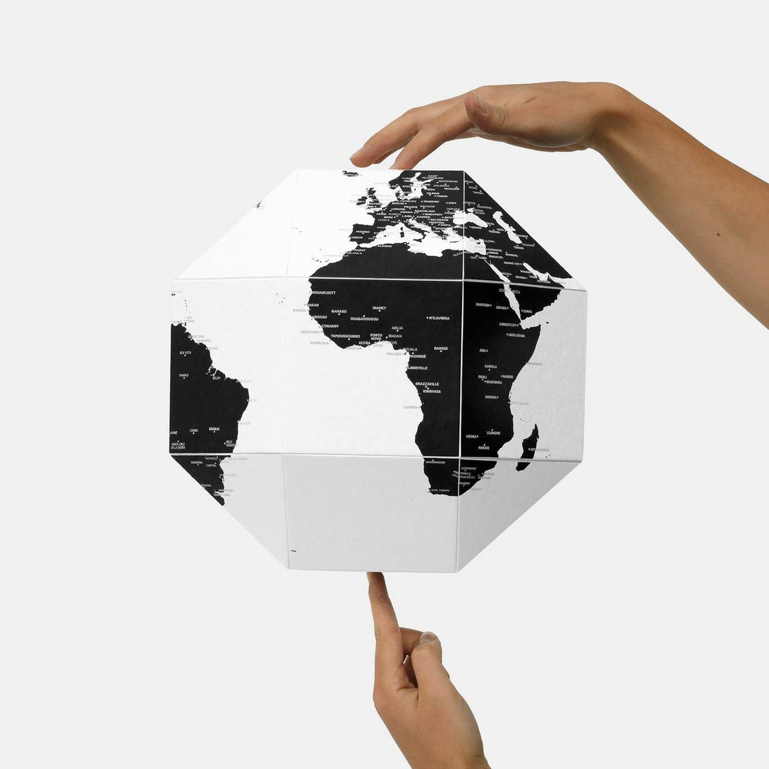 At first this globe looks bi-dimensional, like an atlas. It takes just a few seconds to turn it into a three-dimensional object. The globe is made of a special high quality materic cardboard by Cordenons and the graphics enhance the paper’s preciousness, tactile quality and texture.