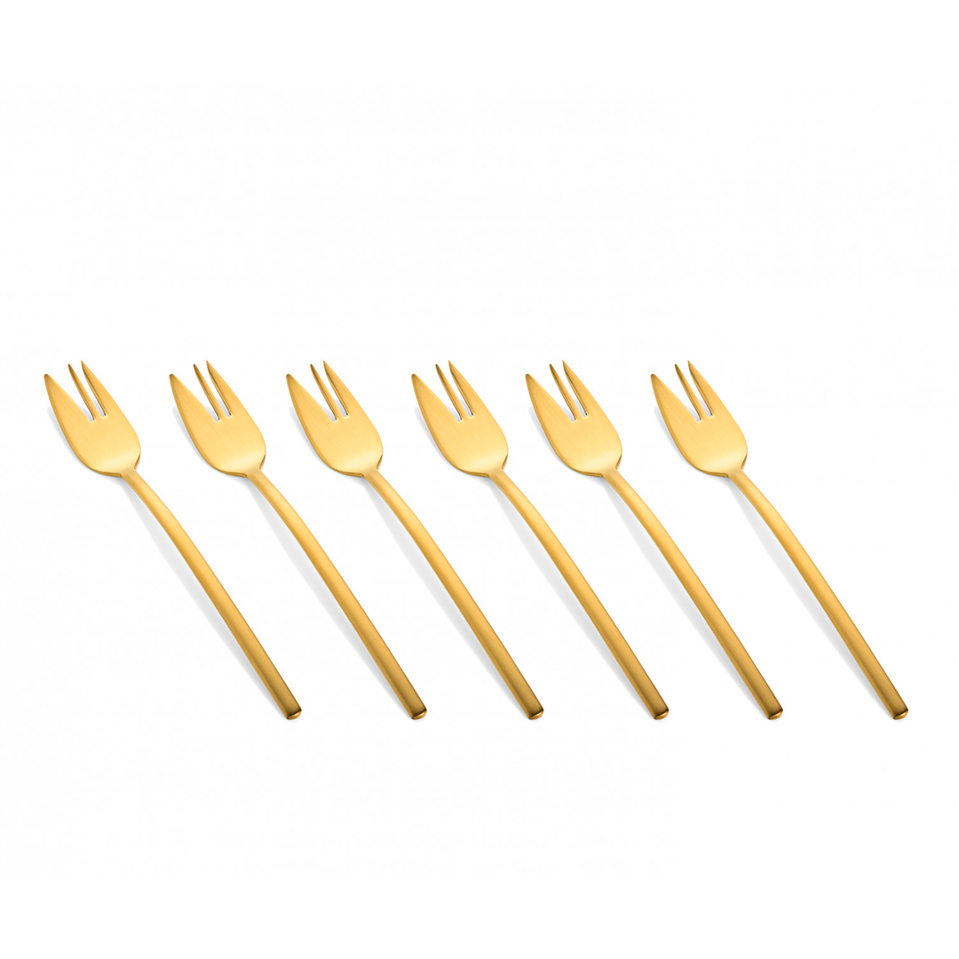 Entertaining for an elegant occasion always requires the finest dinnerware. This brushed gold cake fork set is sure to impress even the most discerning guests, adding a touch of glam to your desserts, no matter the occasion.