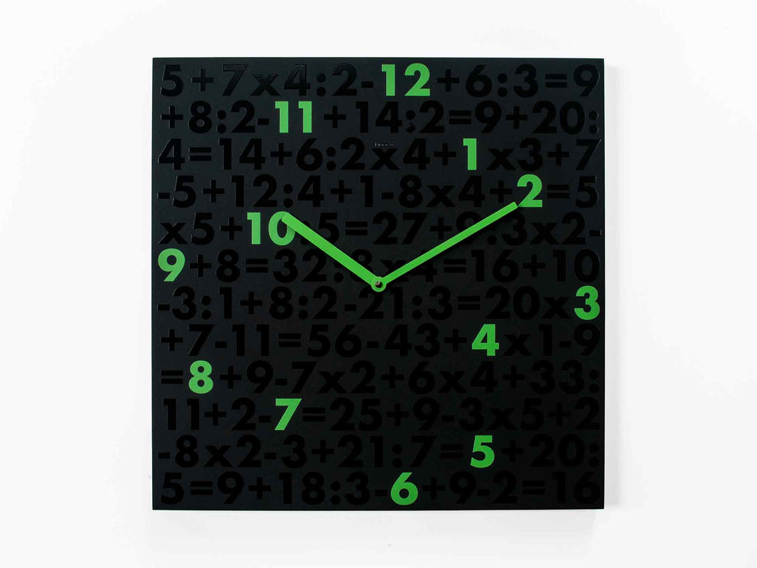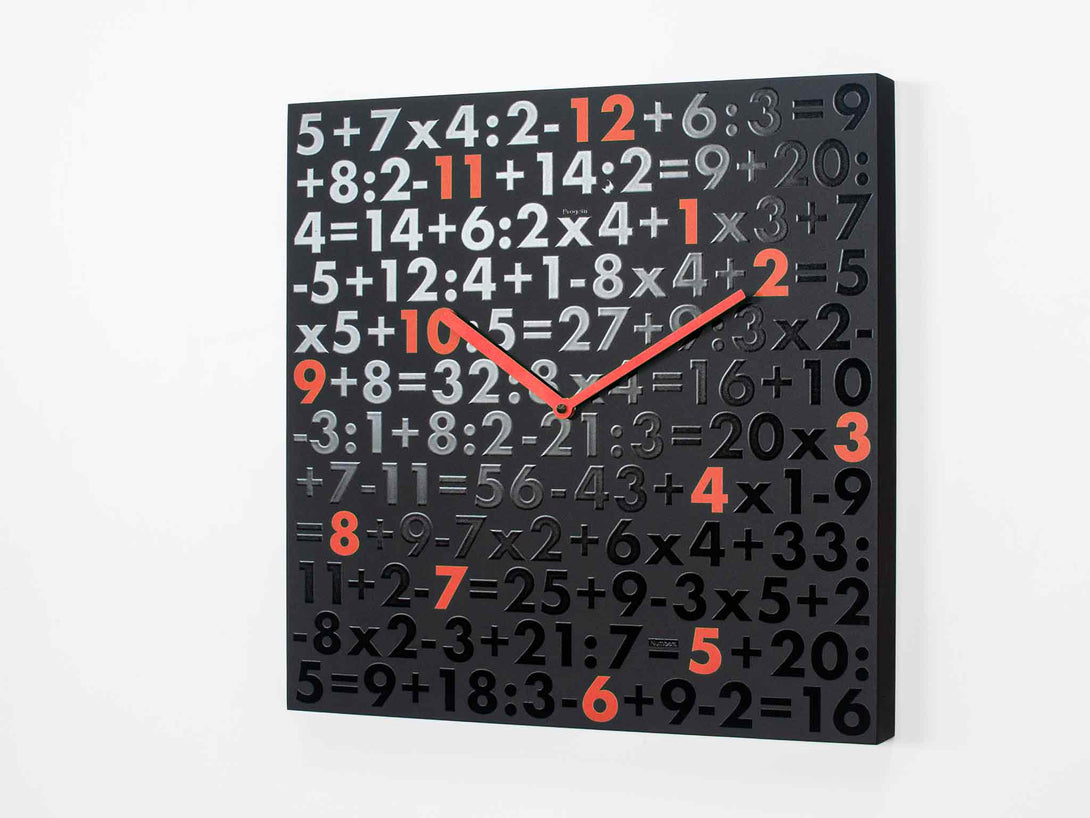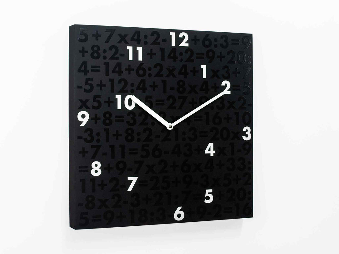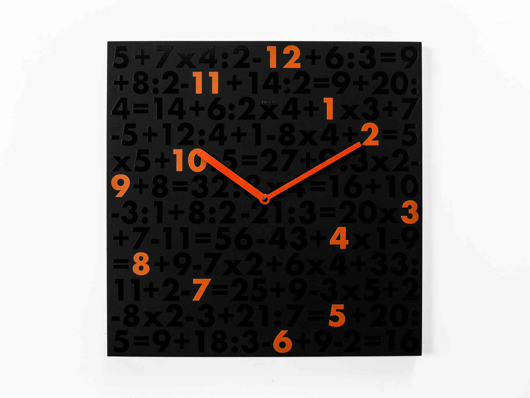 Equo is the wall clock for those who love or hate mathematics. Because the hours on the dial seem to be the result of a continuous series of operations. The writings are glossy and slightly in relief and generated with a particular technique that generates a pleasant contrast with the non-toxic opaque varnish with which the wooden structure is finished. Ideal for any home or office. German made battery operated quartz movement.