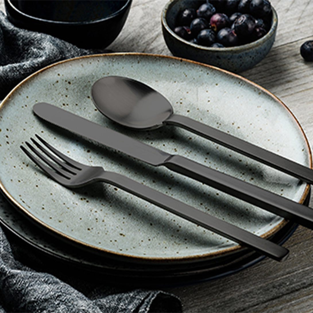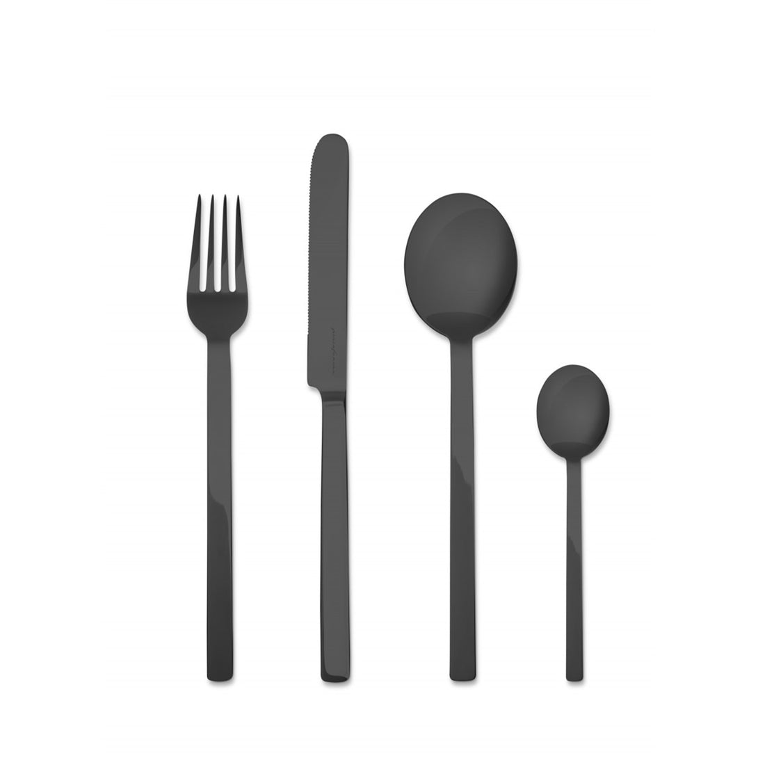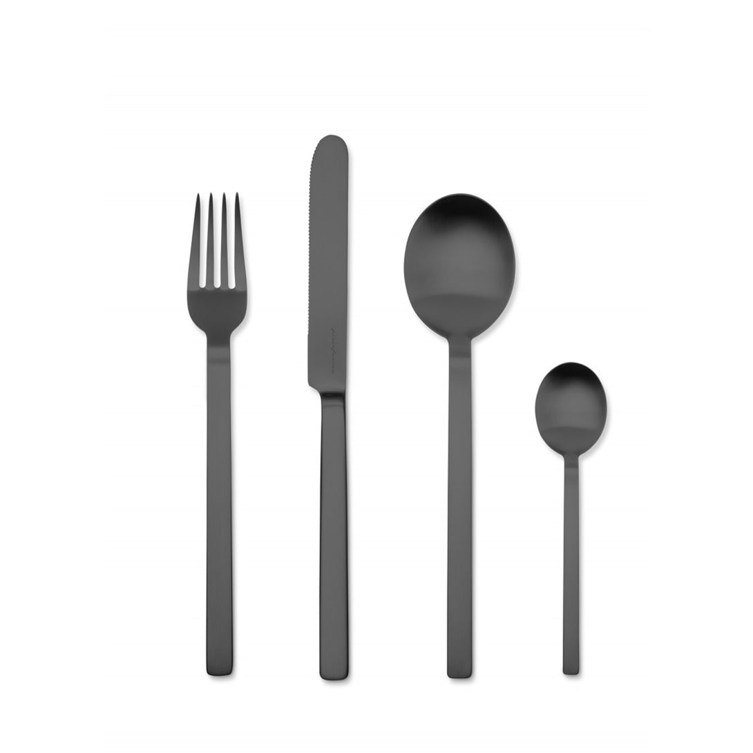 Winner of the Red Dot Design Award. Available in polished or matt black. The set includes 6 table knives, 6 table forks, 6 table spoons and 6 coffee and tea spoons.