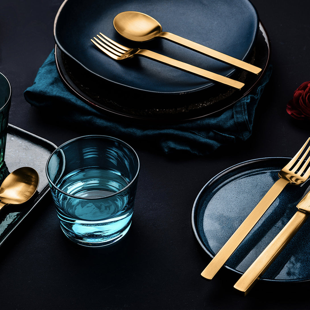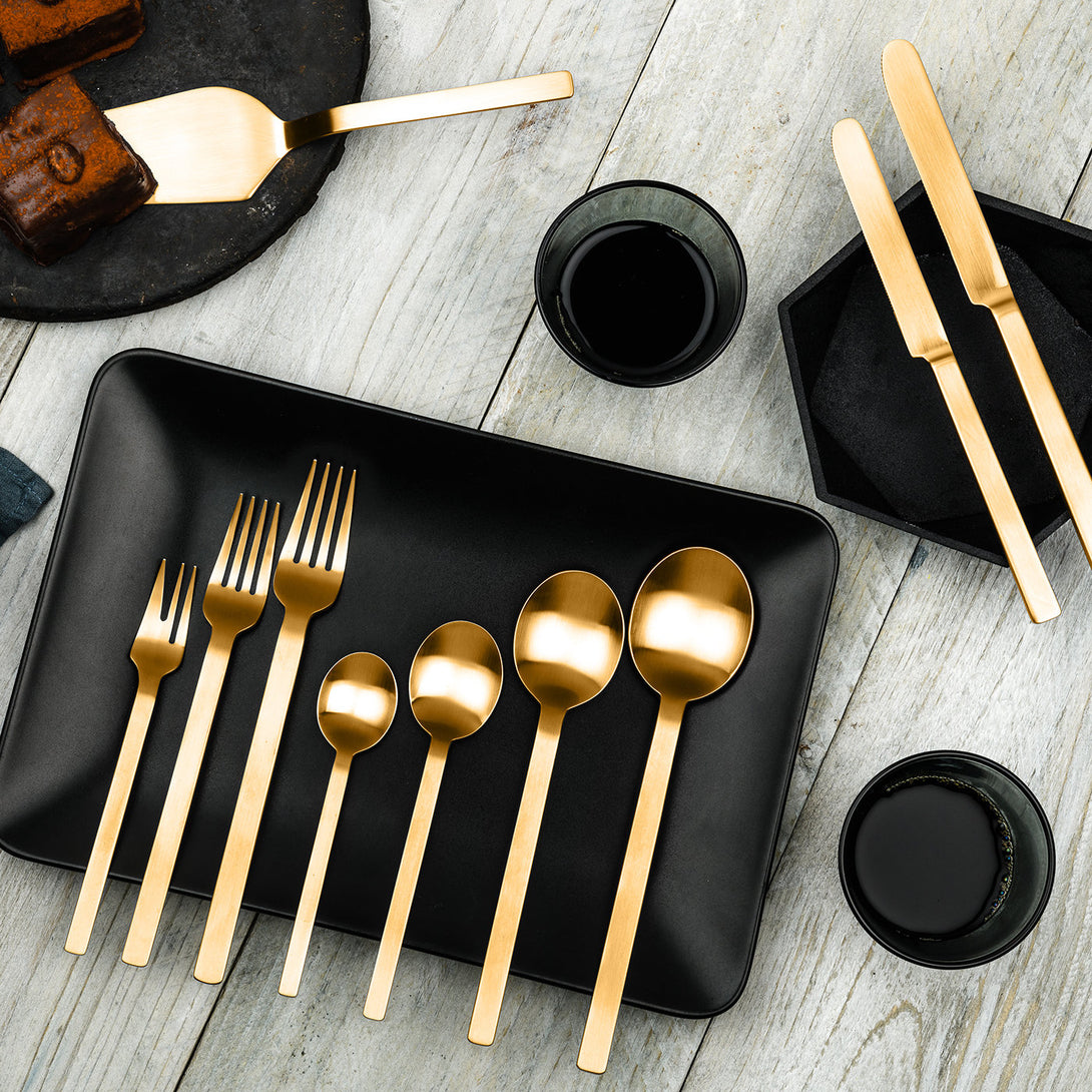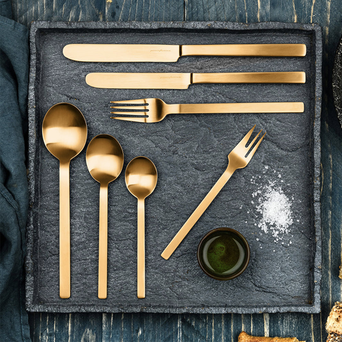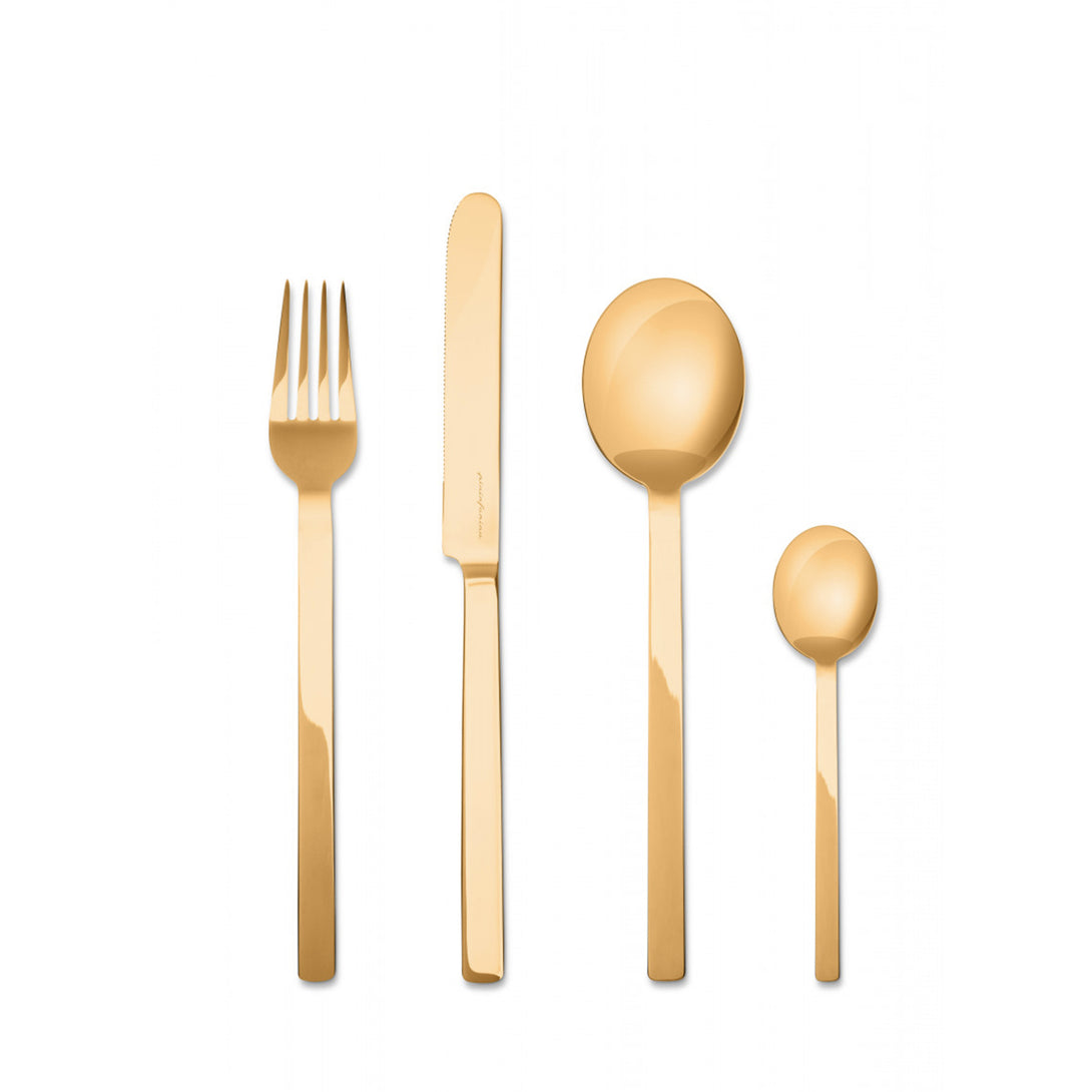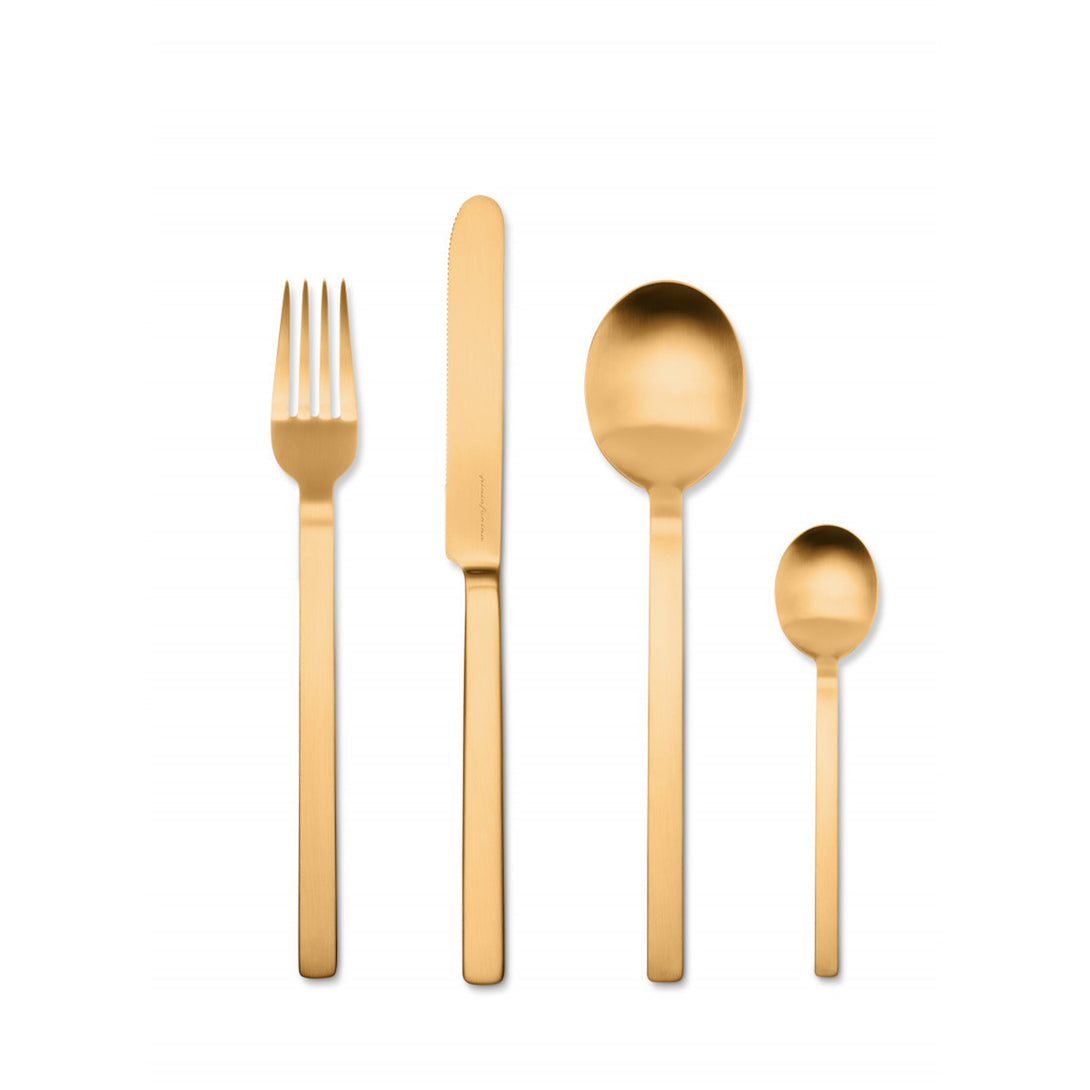 Winner of the Red Dot Design Award. Available in polished or matt gold. The set includes 6 table knives, 6 table forks, 6 table spoons and 6 coffee and tea spoons.