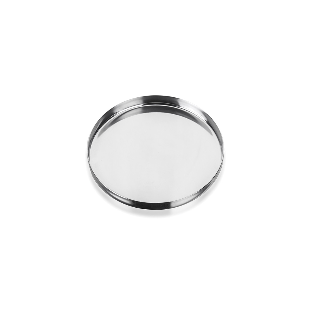 This round coaster is made of stainless steel and features a polished mirror finish.