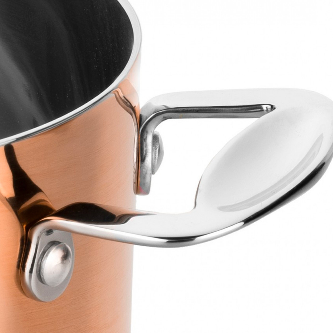 MATERIALS: Outer layer in copper (material with highest conductivity after silver), aluminum (lightweight, non-corrosive and non-toxic), inner layer in 18/10 stainless steel (the most hygienic and easiest to clean material).