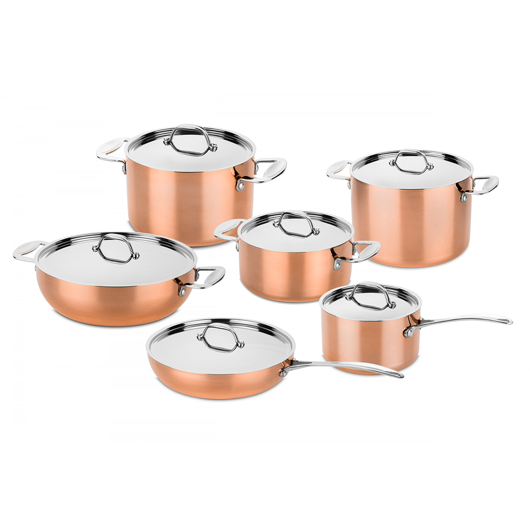 Toscana pots and pans set by Mepra are made of an aluminum core sandwiched between and inside layer of 18/10 stainless steel and copper outside, guaranteeing excellent heat conducting properties.