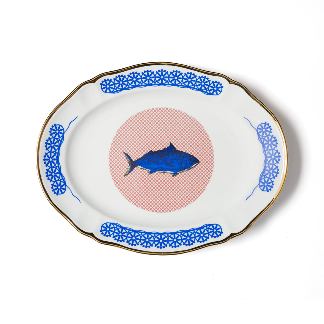A wonderful aesthetic and nostalgic journey. Bel Paese is the new and unusual story created by French designer Sam Baron. These porcelain plates are decorated with beautiful vintage illustrations inspired by old "citrus papers". These small squares of silk paper decorated with a central motif were used to pack oranges in the last century. As part of the popular cultural heritage of the 20th century, citrus papers have become a rare commodity found only on the stalls of luxury grocers and collectors! The deliciously retro imagery is totally updated with flashy colours, modern patterns and offbeat details. Simple and showy, the patterns respond to a popular, naive inspiration, made up of poetry and ingenuous symbolism, traits that are reminiscent of children's drawings. Honest, warm tones, blue and red are the natural preference. A retro pop imagery, tinged with humour, poetry and mystery...