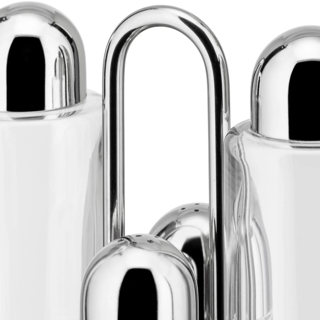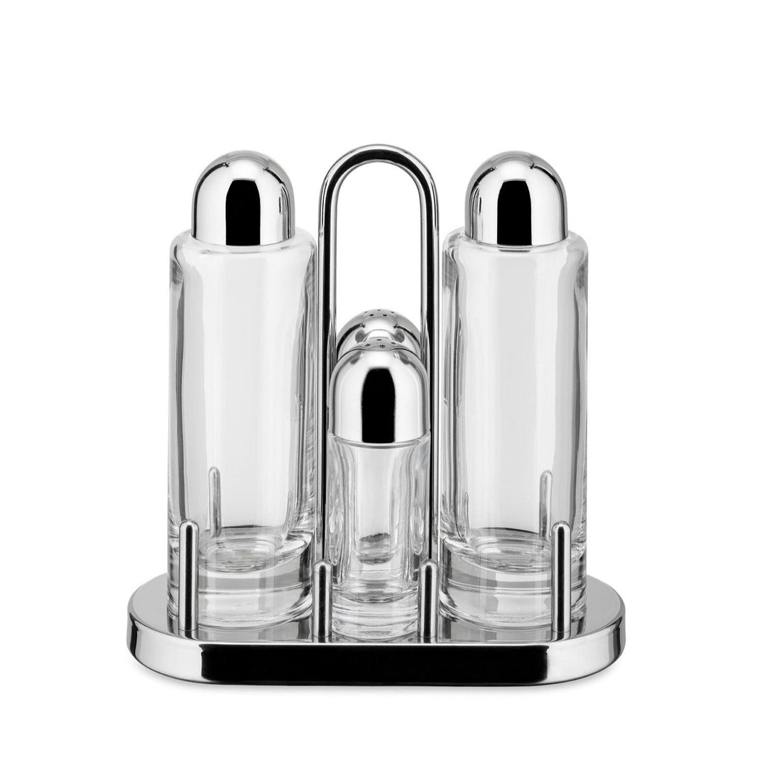 Alessi Condiment Set: Oil, Vinegar, Salt & Pepper. A timeless design by Ettore Sottsass, this condiment set is beautifully finished and will compliment any table setting, traditional or modern.