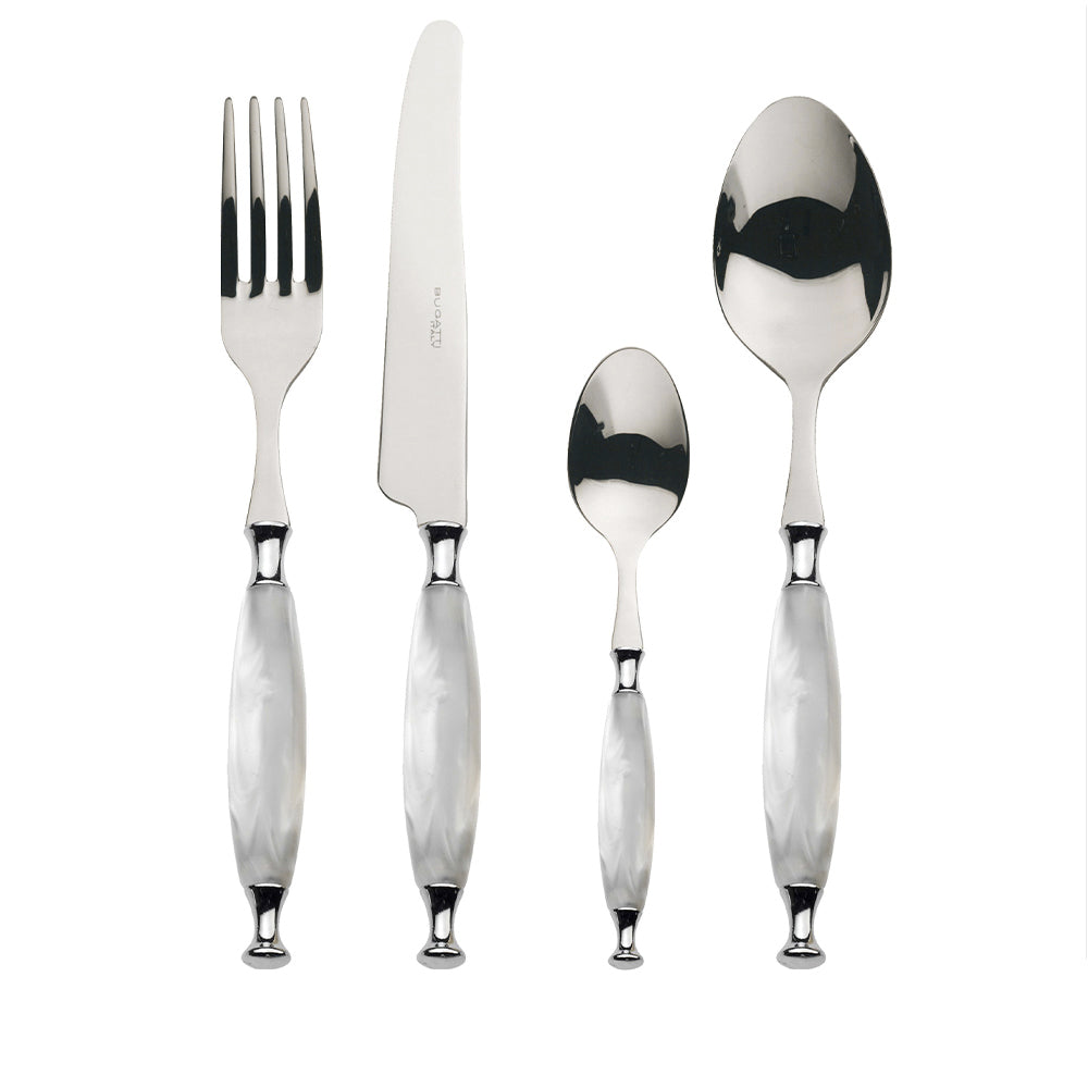 Country coloured cutlery set features a softly rounded, mother-of-pearl effect acrylic handle and a polished steel tapered ring. An essential accessory to bring charm and personality to your table.