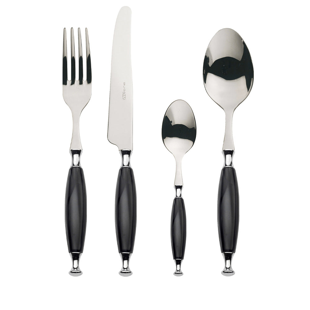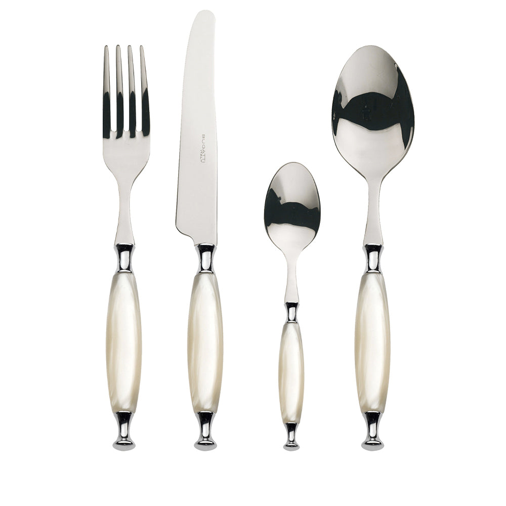 Country coloured cutlery set features a softly rounded, mother-of-pearl effect acrylic handle and a polished steel tapered ring. An essential accessory to bring charm and personality to your table.