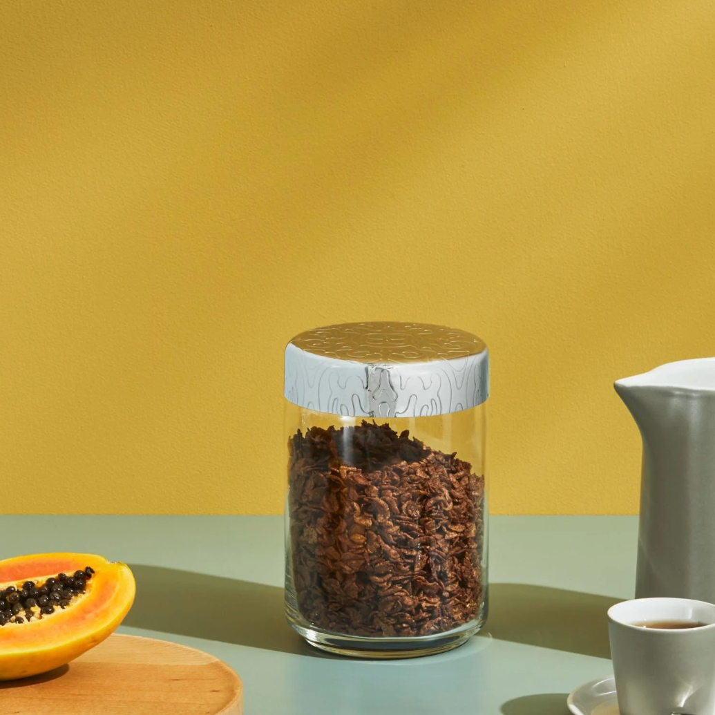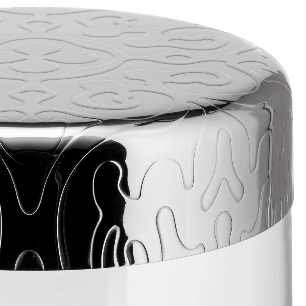 MATERIALS: Glass jar. Hermetic lid in 18/10 stainless steel mirror polished with relief decoration.