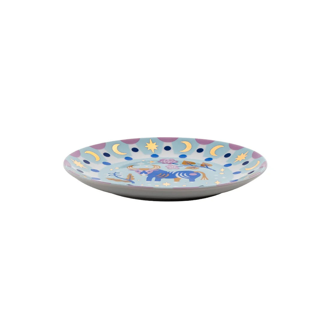 Each plate is dedicated to a zodiac sign and features a vibrant background inspired by its elemental group: Earth, Water, Fire, or Air.