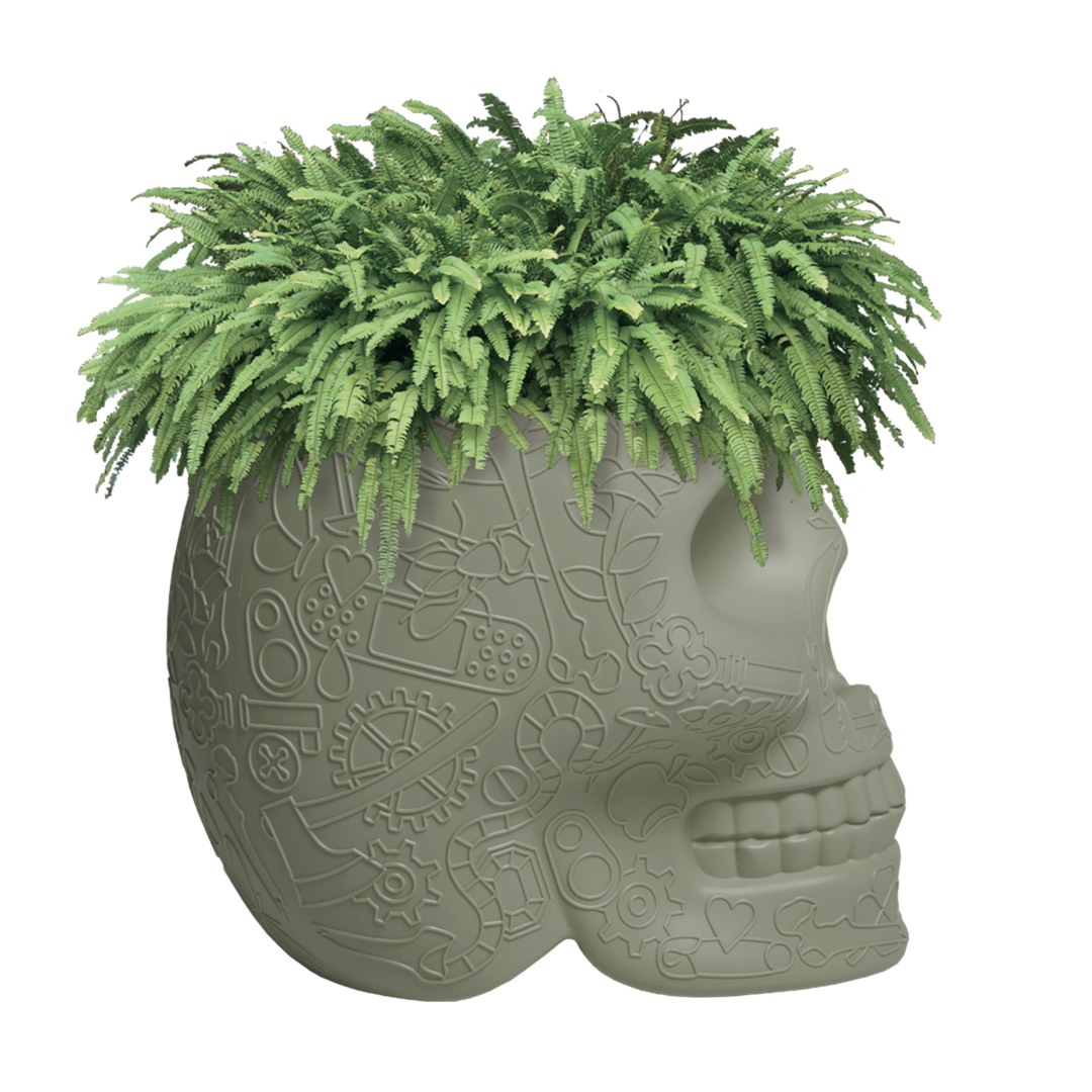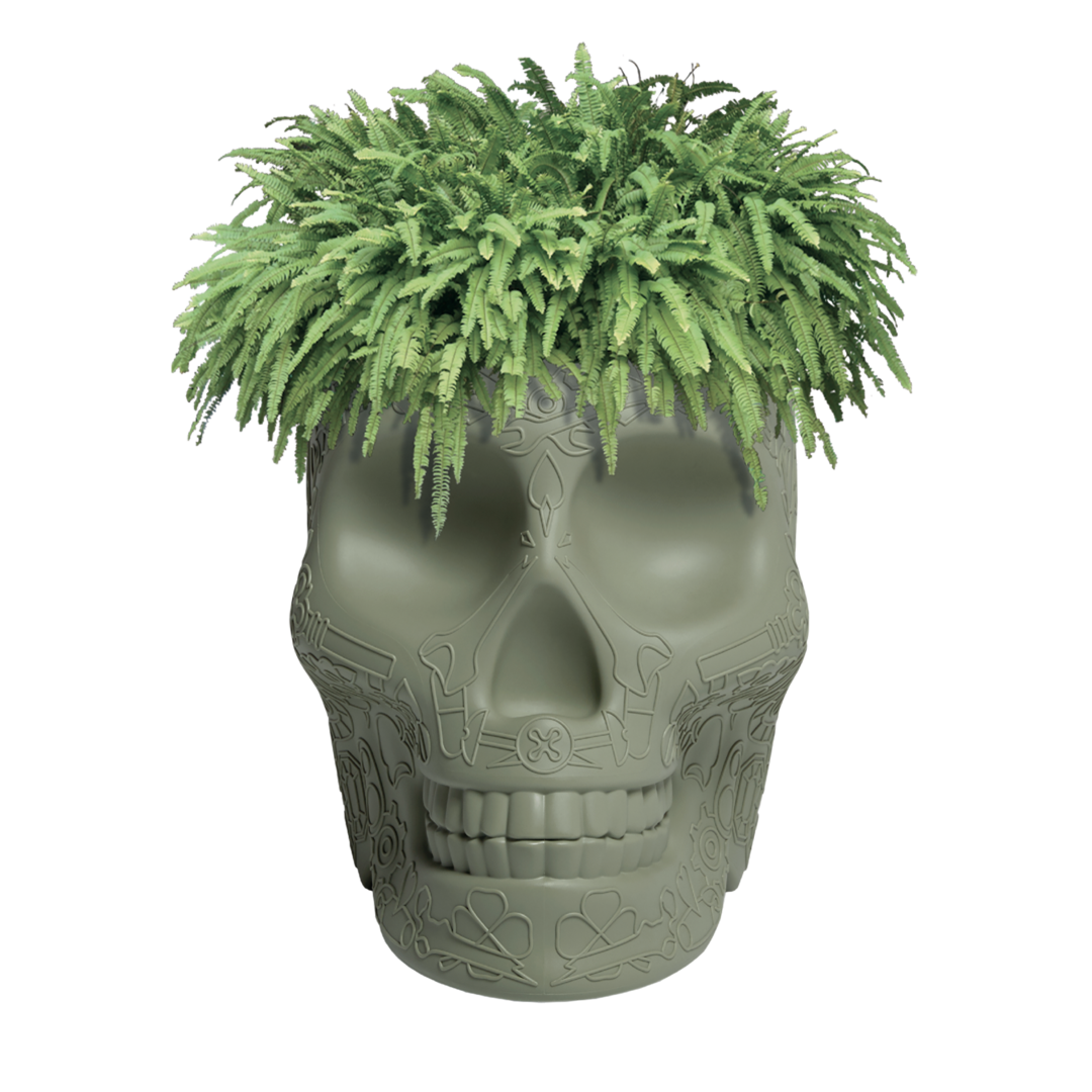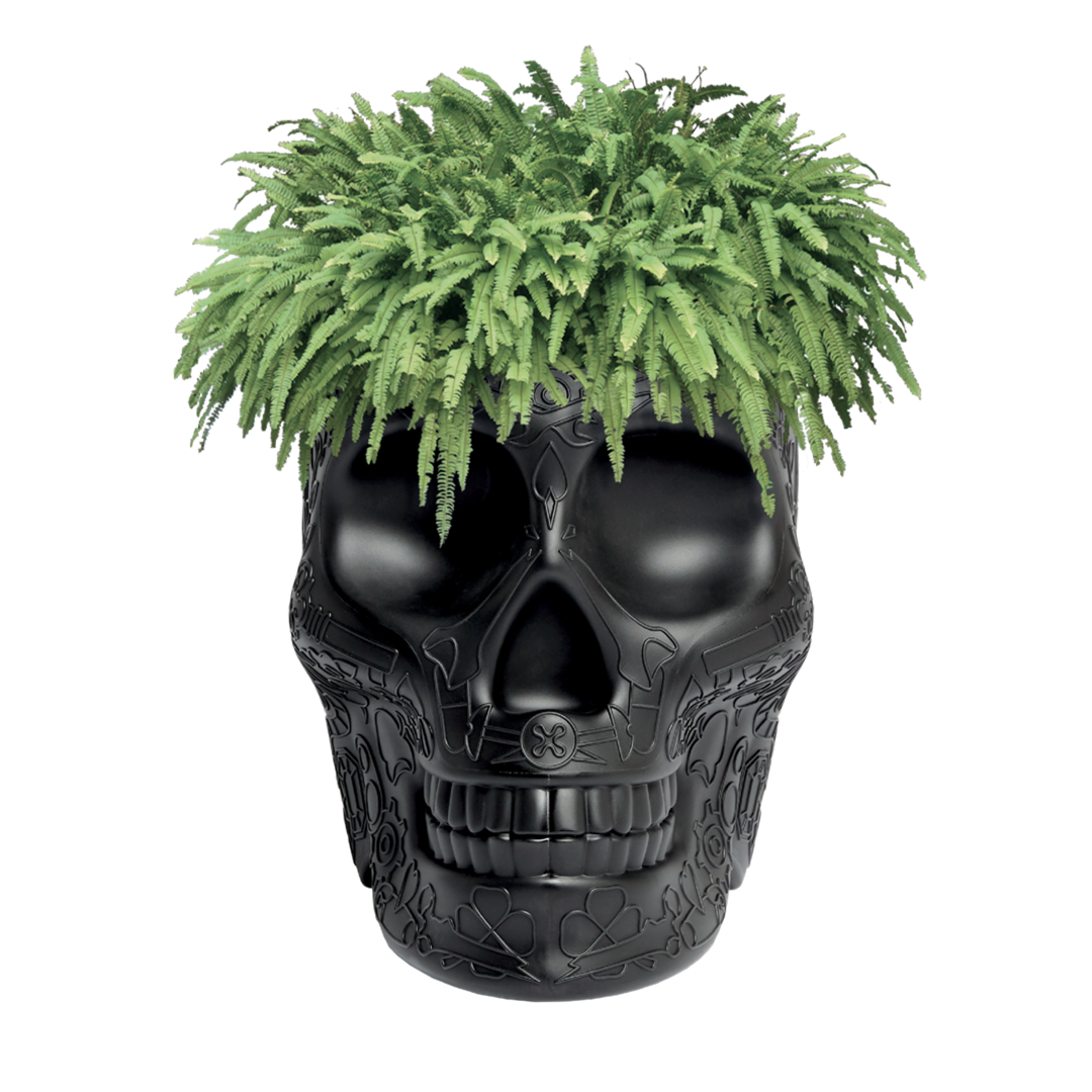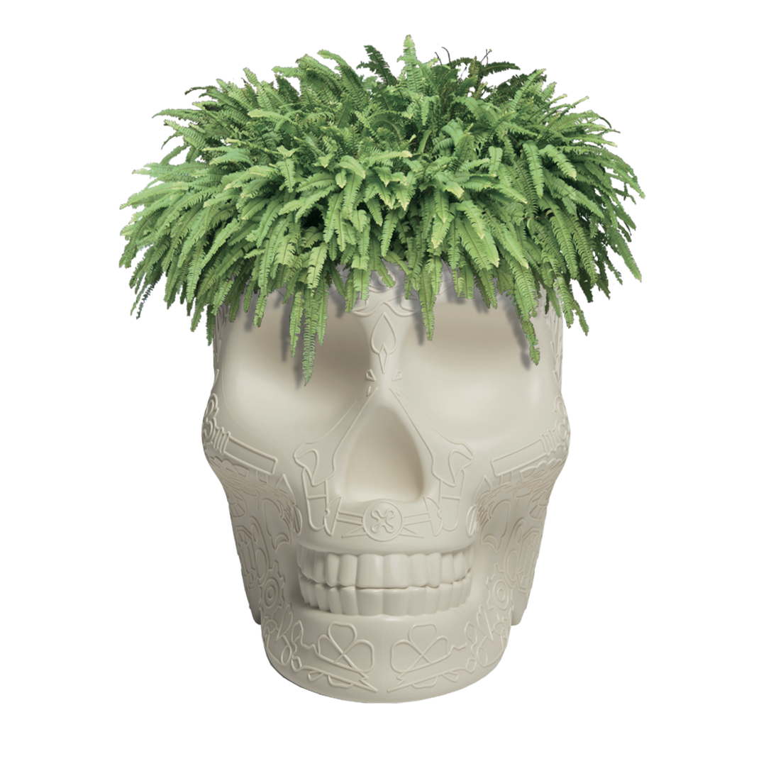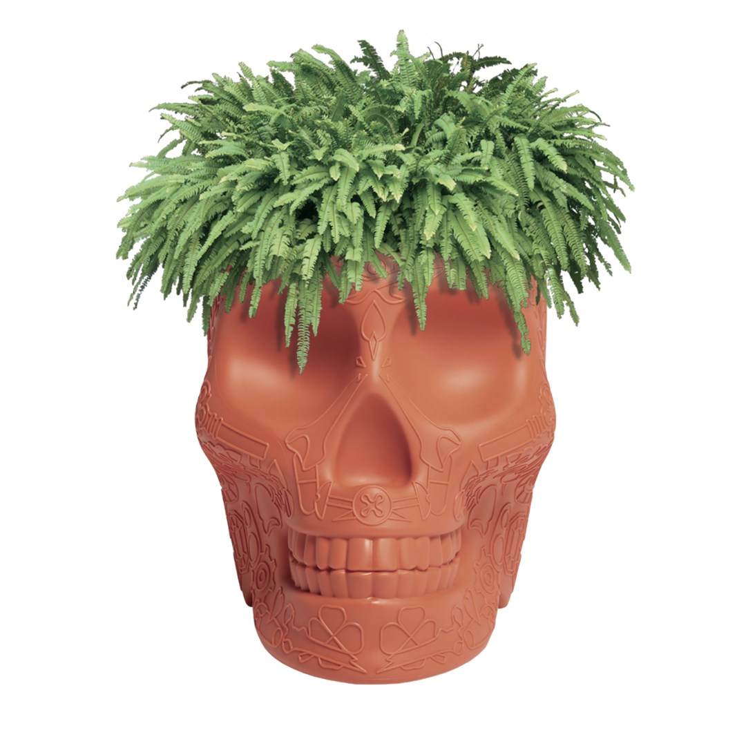Mexico by Qeeboo, designed by Studio Job, is a skull-like design object with a graphic pattern on the surface, functioning both as a planter and champagne cooler. Reminding of the traditional painted skulls from the homonymous country, Mexico is a whimsical reminder of the cyclicality of our presence on Earth, to exorcise death and celebrate life. Perfect for lounge areas, dining rooms and outdoors spaces.