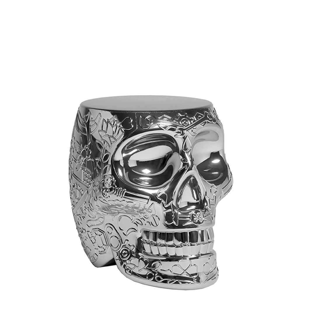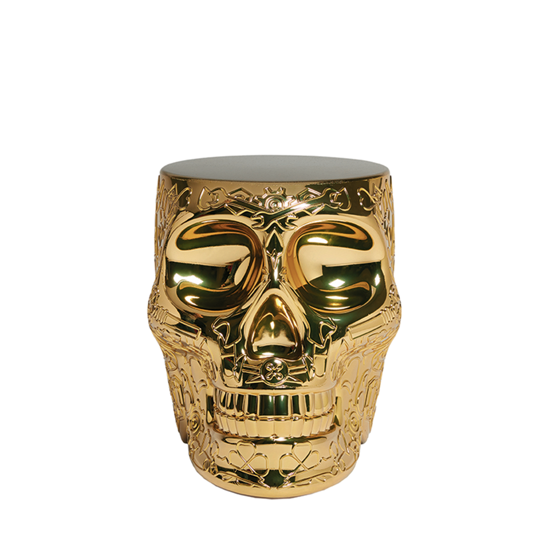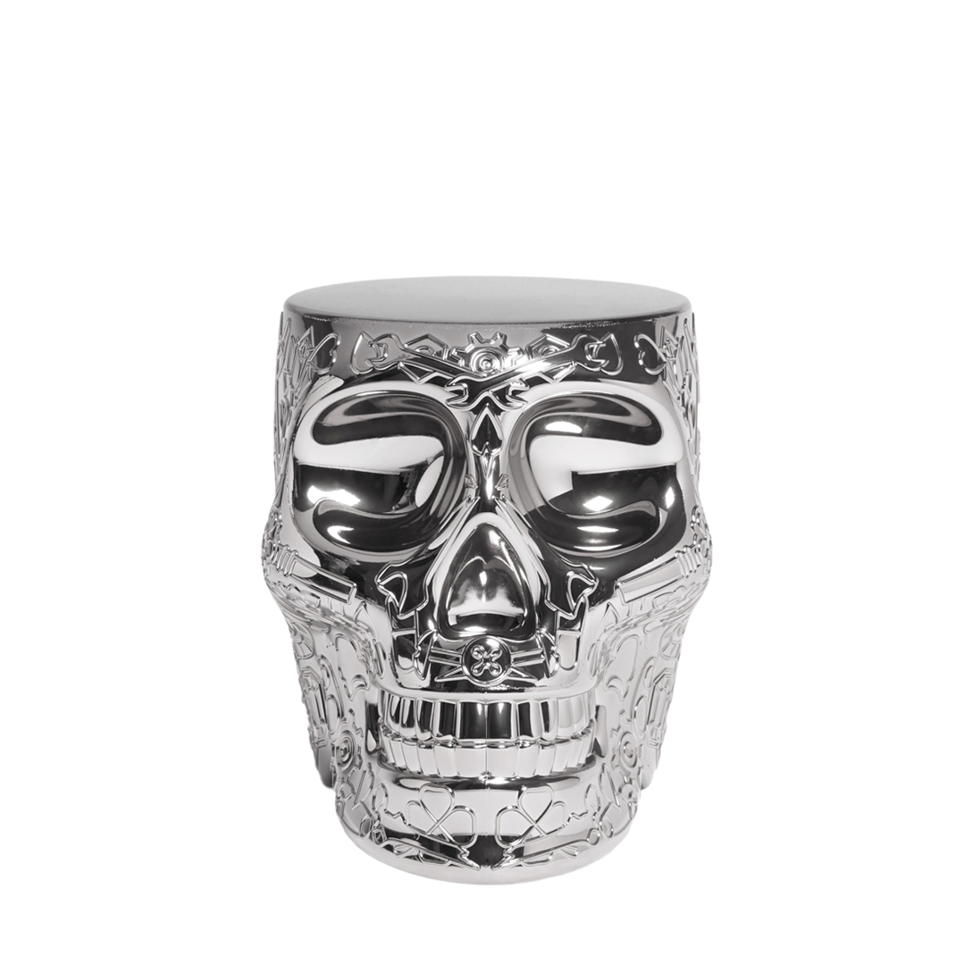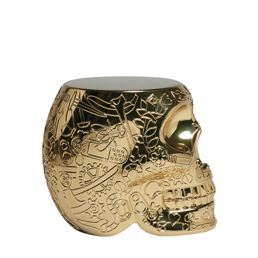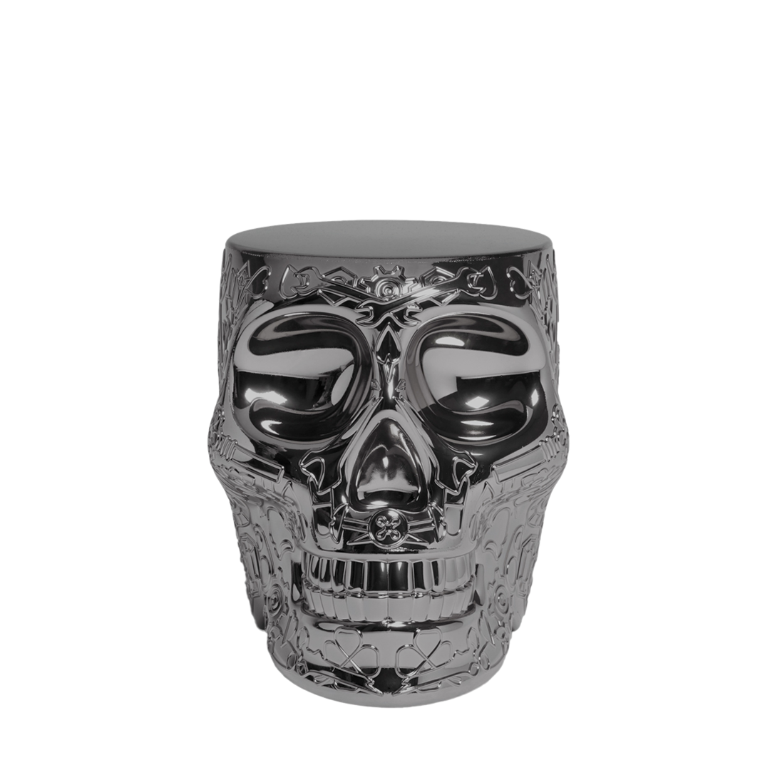 Mexico by Qeeboo, designed by Studio Job, is a skull-like design object with a graphic pattern on the surface, functioning both as a stool or a side table. Reminding of the traditional painted skulls from the homonymous country, Mexico is a whimsical reminder of the cyclicality of our presence on Earth, to exorcise death and celebrate life. Metal-finished, it's suitable for indoor use only.