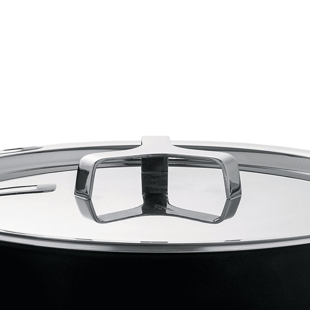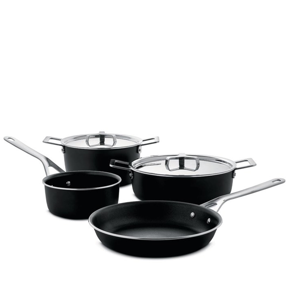 MATERIALS: pans in aluminium with non-stick interior, black. Handle in 18/10 stainless steel. Magnetic steel bottom suitable for induction cooking.