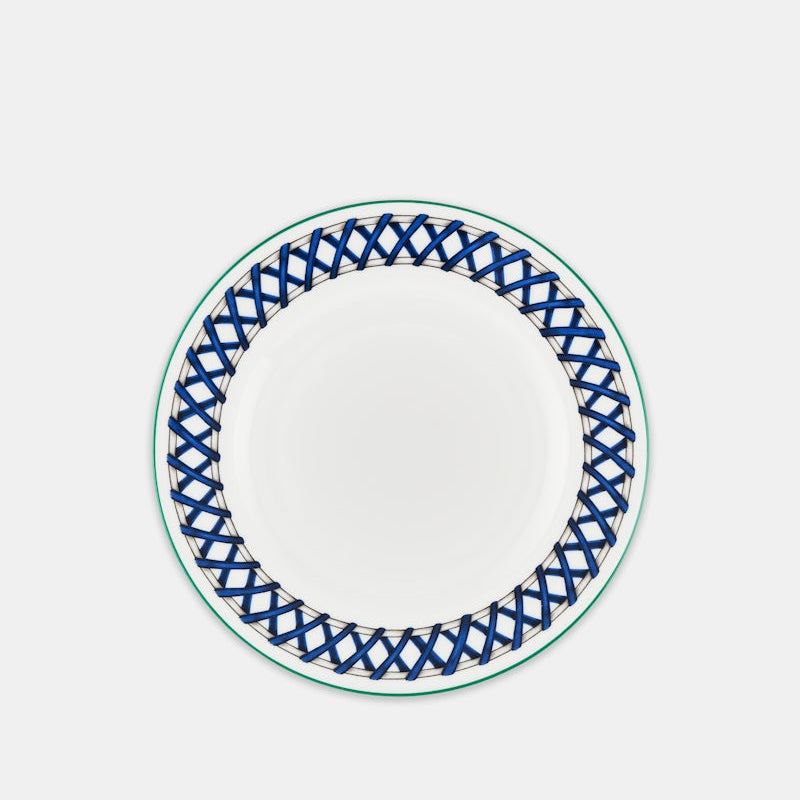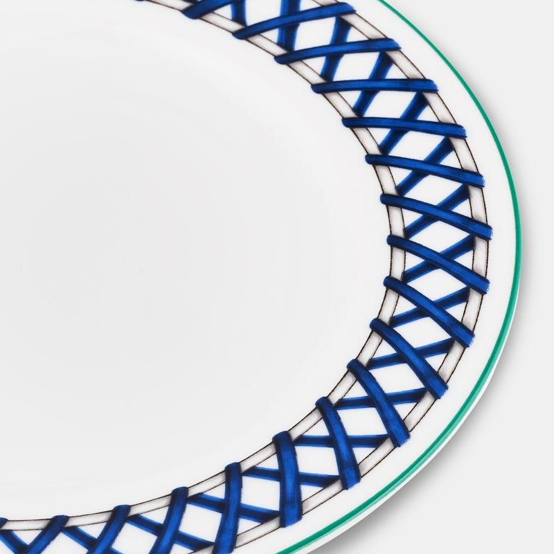 Aquazzura Casa's Riviera tableware is defined by an intricate woven bow design. Crafted in Tuscany from the finest porcelain, this dessert plate features the elegant geometric motif in intense shades of green and blue, recalling the shimmering waters of the Mediterranean sea. Exuding fresh, timeless elegance, this versatile collection is suitable for both summer and winter settings.