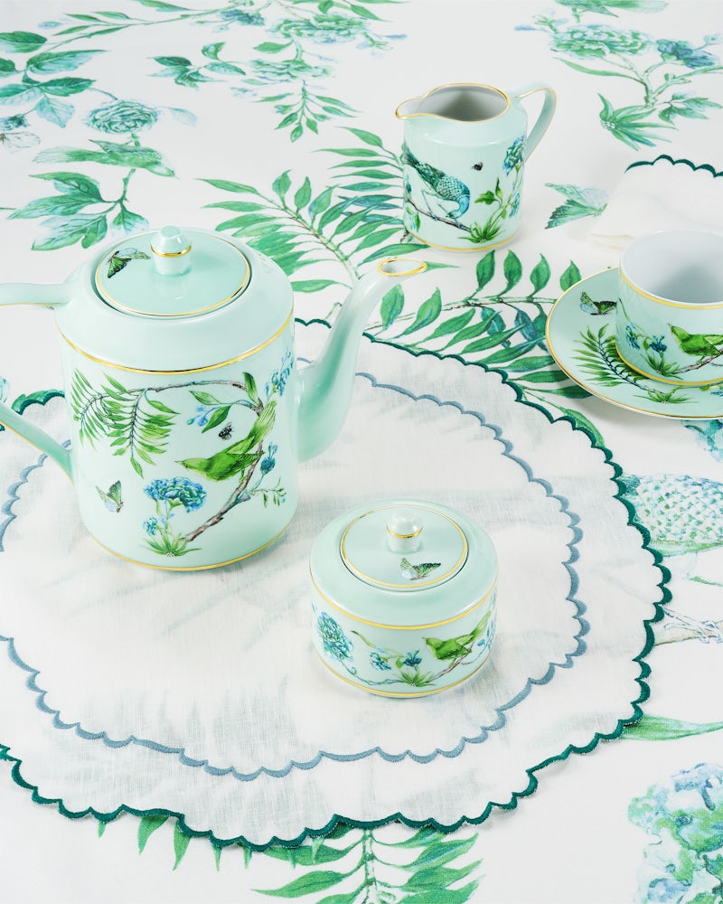 Moving from Edgardo Osorio's penchant for tablescaping, Aquazzura's signature motifs, tactile embroideries, and vibrant prints crowd the homeware collection while evoking the stylistic atmospheres from Japan, China, and India.