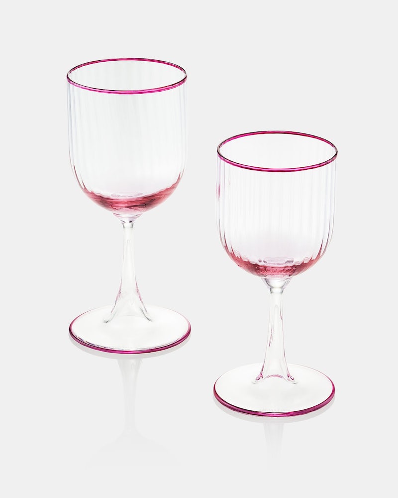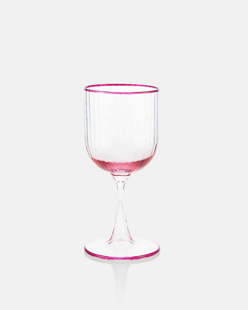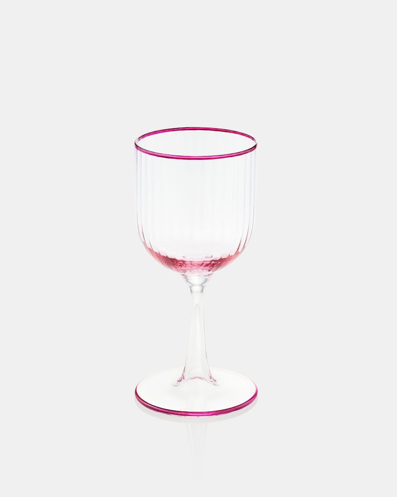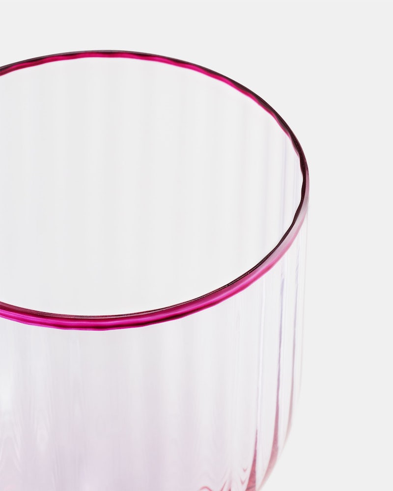 Delight your dinner guests with Aquazzura Casa's luminous Striped Red Wine Glass. Hand-crafted from Murano glass in amethyst rose, the fluted stem is finished with a golden rim. Pair with our other striking glassware to liven up your table setting.