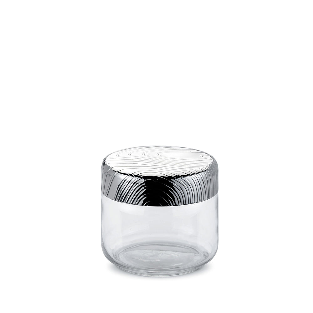 MATERIALS: Glass jar. Hermetic lid in 18/10 stainless steel with relief decoration.